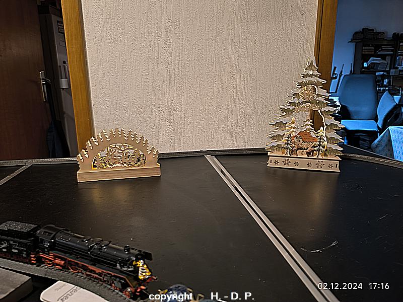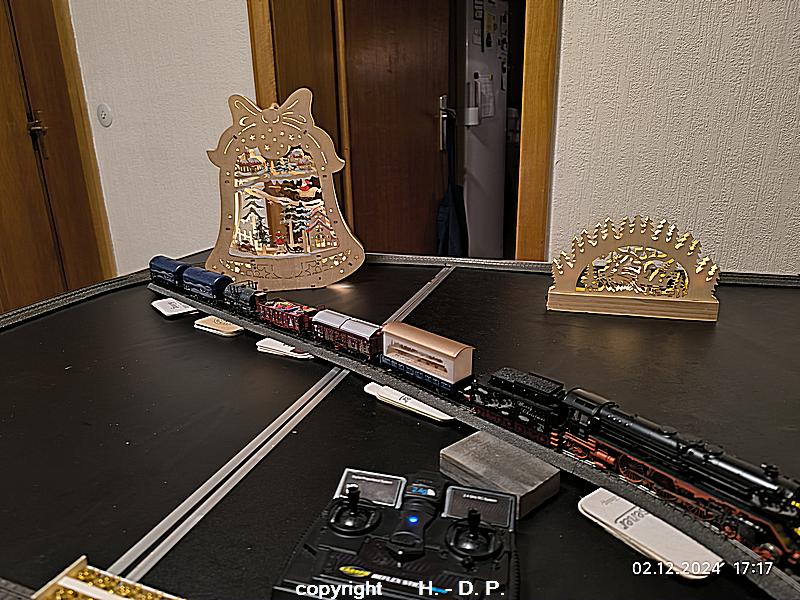 Wie wohl bekannt sein dürfte bin und bleibe ich ein analog Bahner, der aber einmal im Jahr schwach wird und digital fährt. Dieser Ausrutscher findet seit einigen Jahren immer in der Adventszeit statt, weil ich einmal im Jahr den Sound der Weihnachtslok und seit dem letzten Jahr der Weihnachtsloks hören möchte. Dazu werden 3 klappbare Tapeziertische nebeneinander gestellt, diese <tische haben die Maße 1 m x 0,60 m und das ergibt dann ein <oval von 1,80 m Länge. OK das ist nicht groß, aber es macht trotzdem viel Spaß und natürlich kann ich auf der recht kurzen Strecke auch nicht alle meine Weihnachtswagen einsetzen.