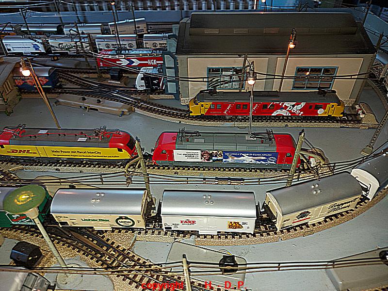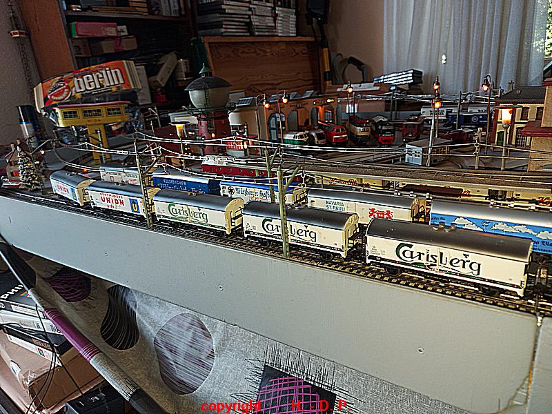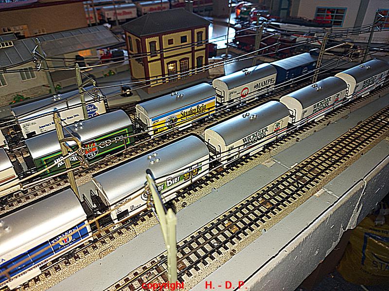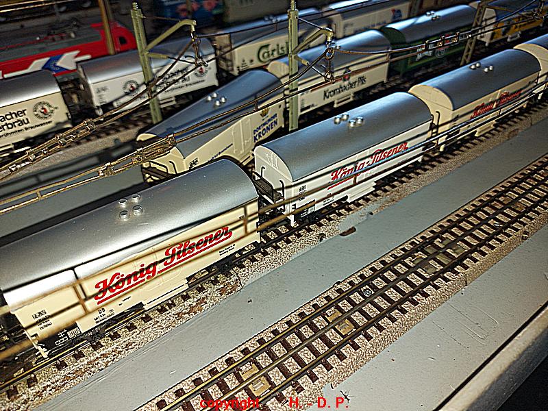 54 dieser Bierwagen stammen von Märklin und 2 von Fleischmann und die Loks stammen von Mehano, Märklin und Piko