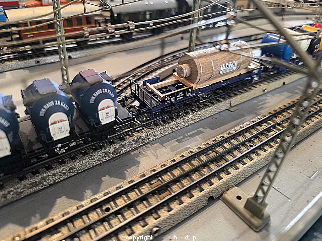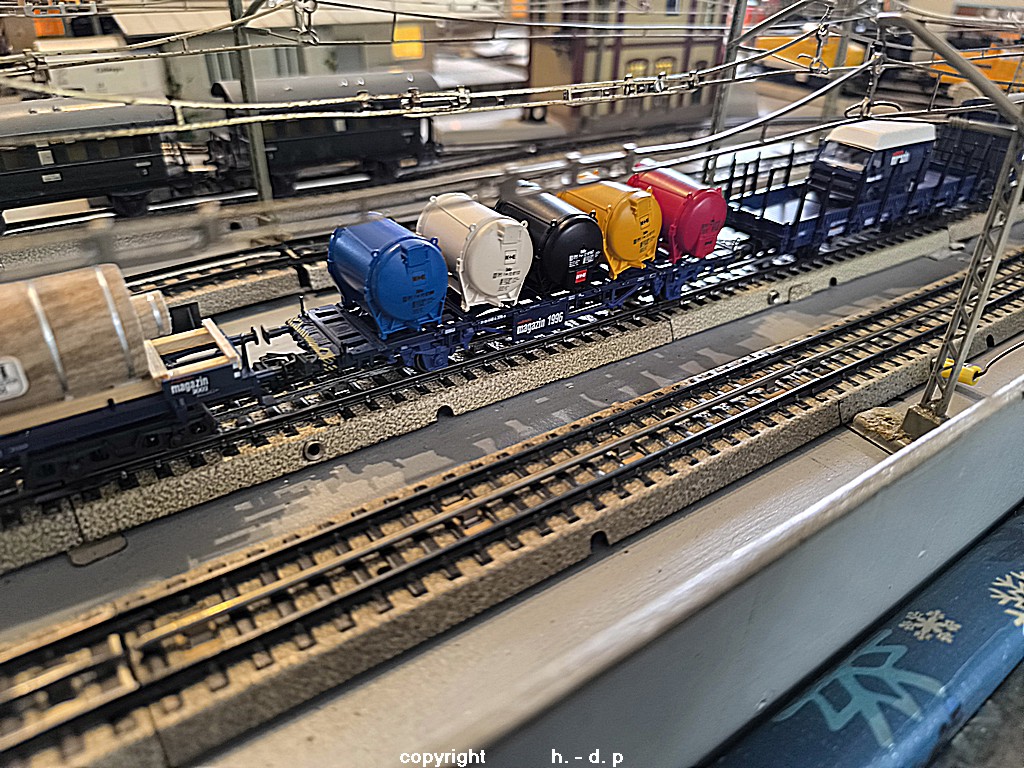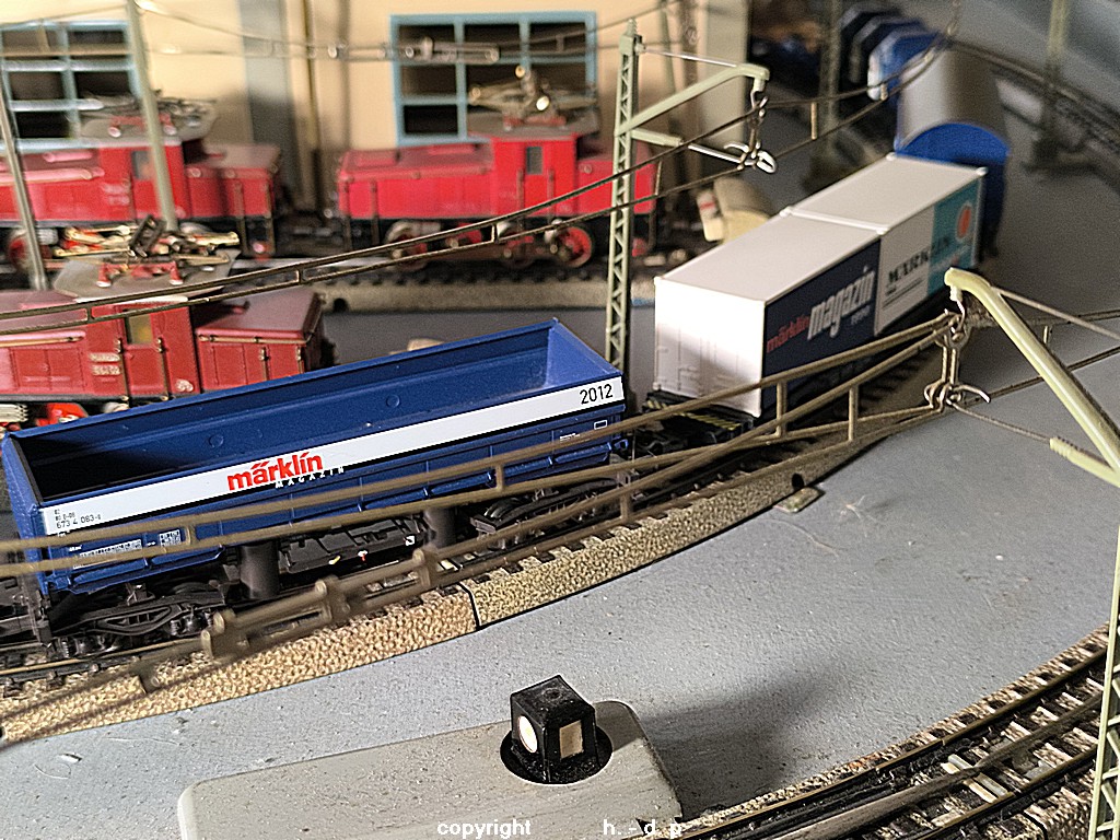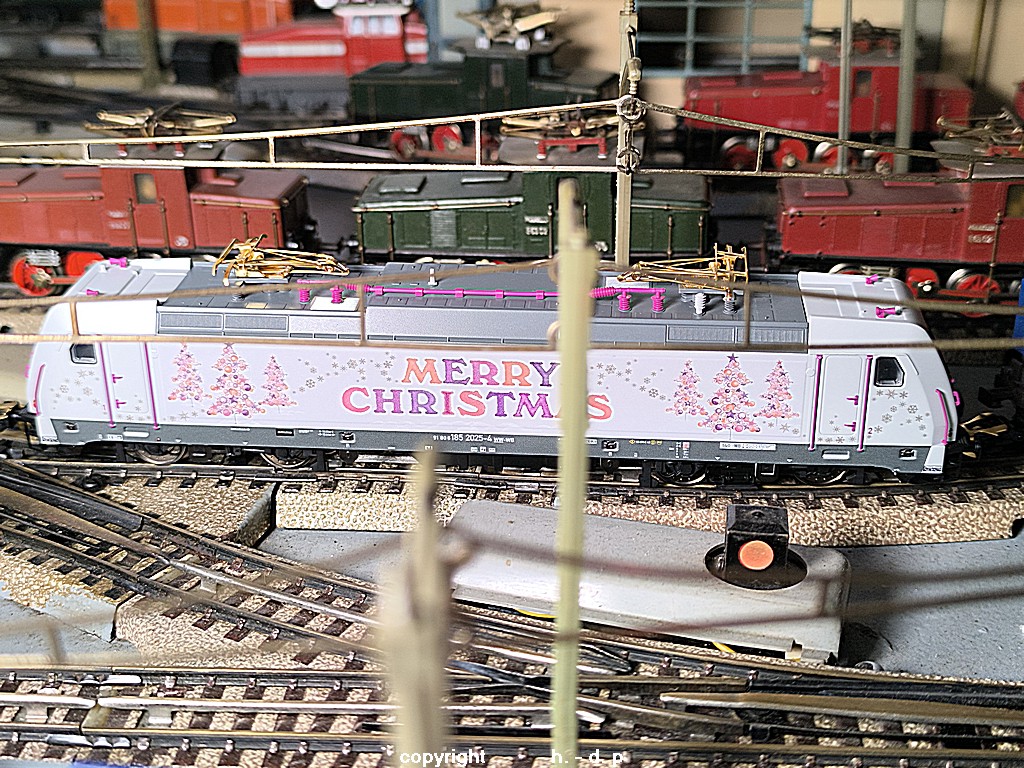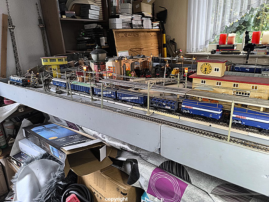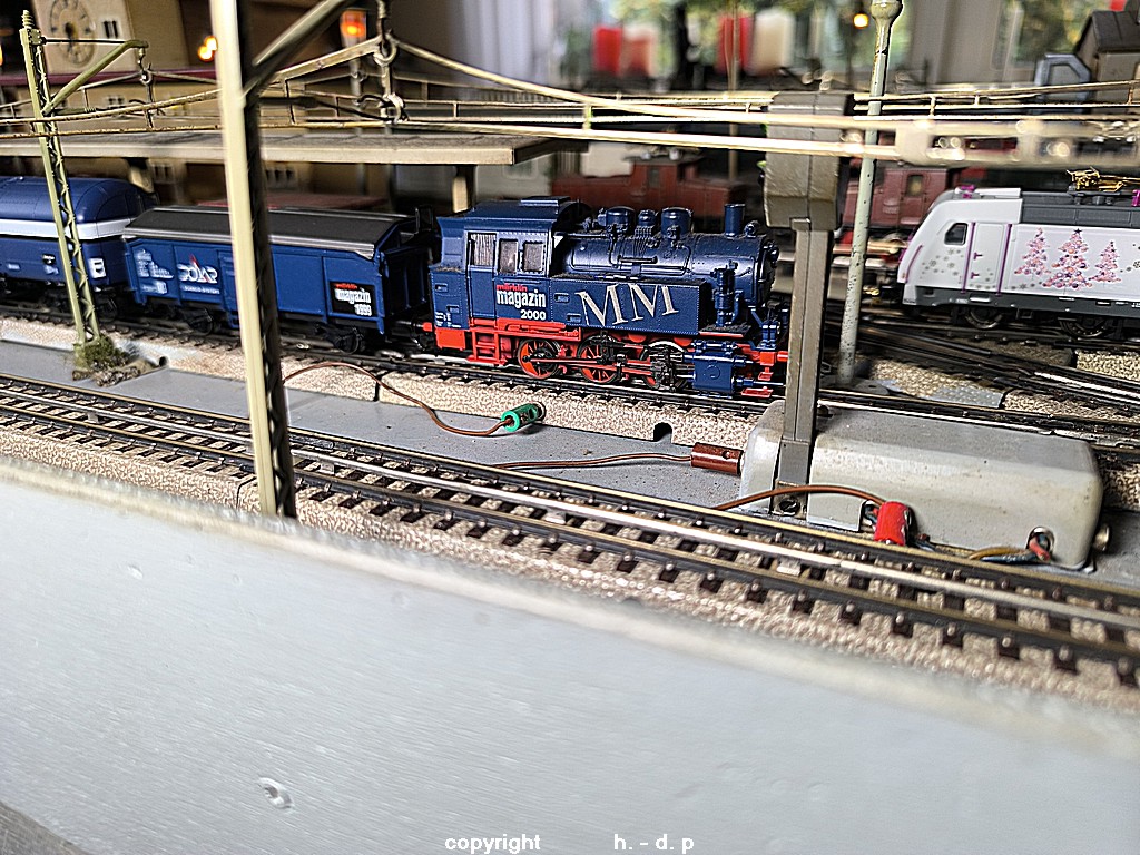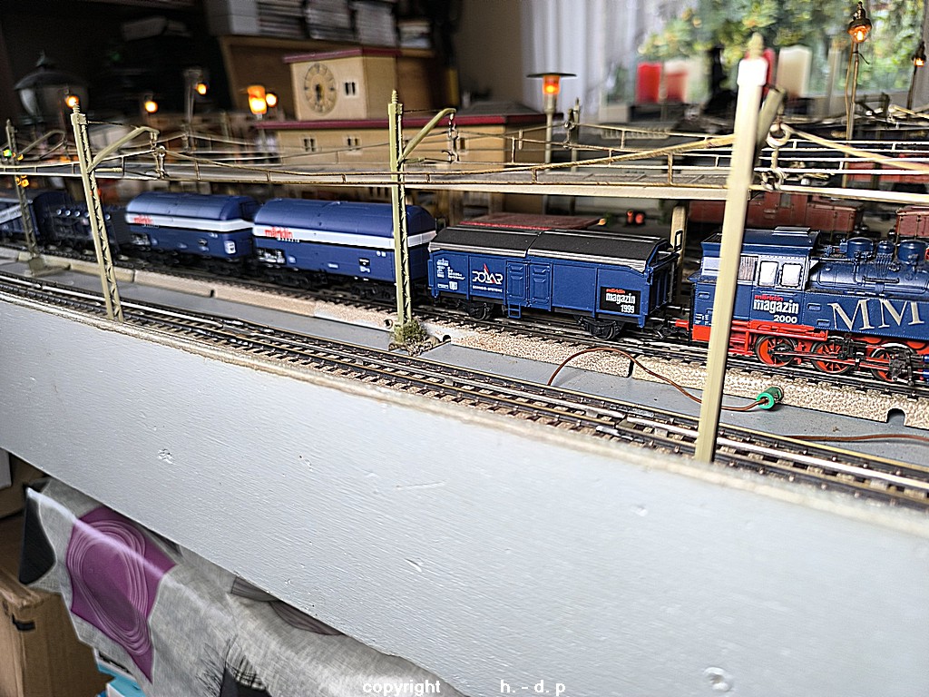 Die Weihnachtslok zieht heute noch einige MM Wagen, denn für Weihnachtswageni ist es noch einige Wochen zu früh, leider. Mir persönlich gefällt die MM Lok um einiges besser als die in meinen Augen etwas zu schlichte Weihnachtslok. Da ich bis heute 27 MM Wagen habe und meine Anlage nur 2,30 m lang ist, habe ich die Wagen auf 3 Züge aufgeteilt. Die meisten hängen hinter der neuen Weihnachtslok und die restlichen werden gezogen von der neuen MM Lok und der alten, das ist eine kleine BR 80.