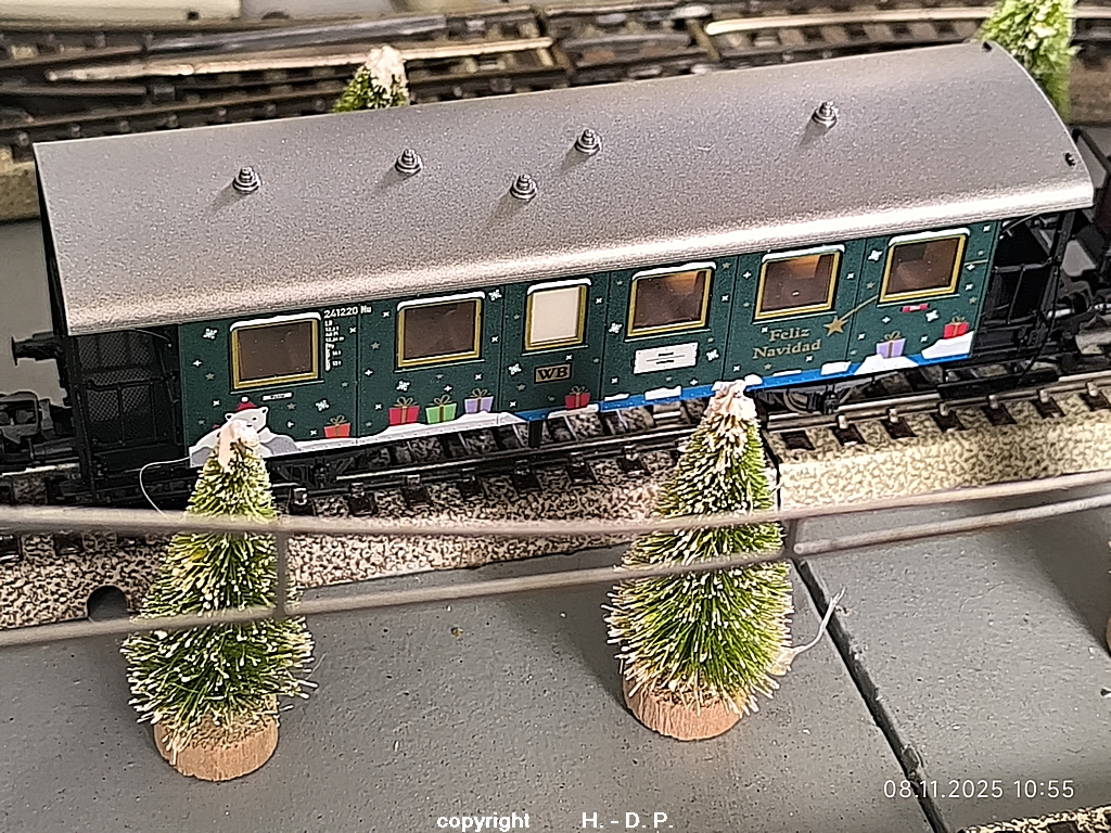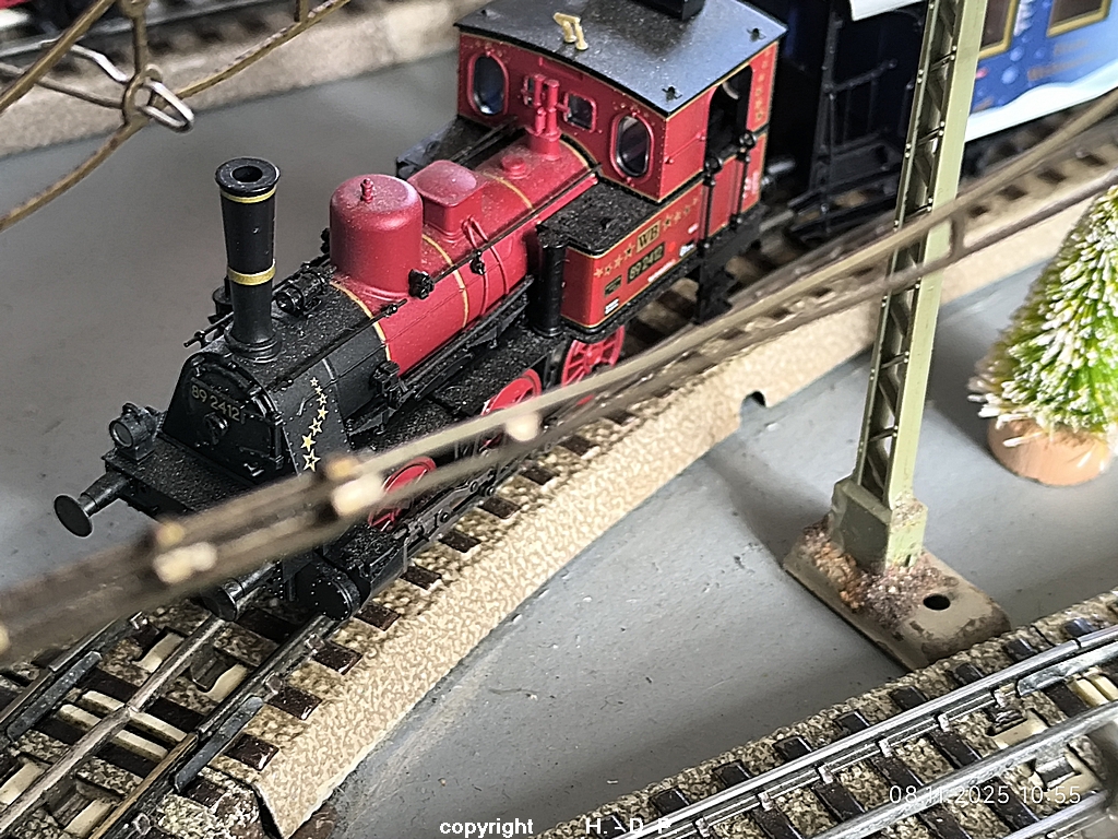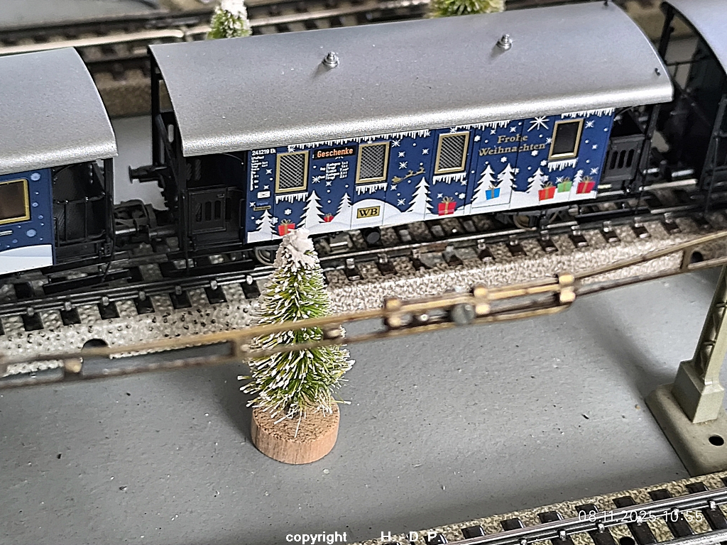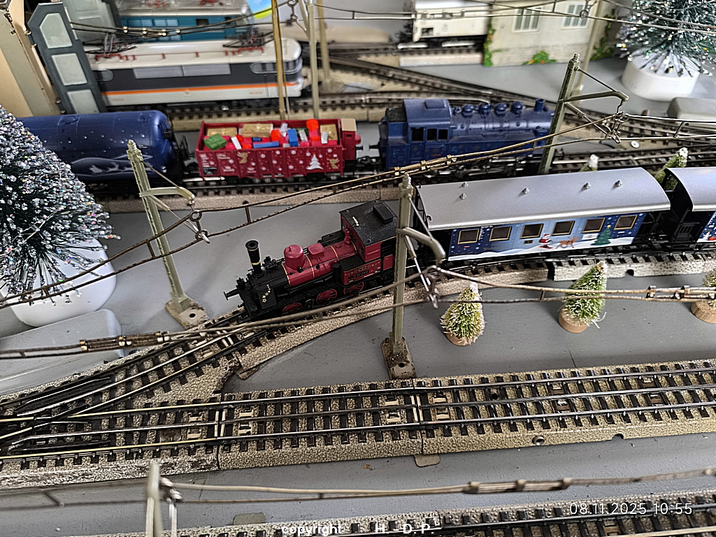 Es gehen geheimnisvolle Dinge in Heinhausen vor. Gesten habe ich doch tatsächlich eine kleine Dampflok mit 3 Personenwagen und einem Kesselwagen gesehen, die alle schon weihnachtliche Aufdrucke hatten. Dazu kam auch noch ein kurzer Güterzug mit der Dampflok BR 81, die auch schon im weihnachtlichen Glanz zu sehen war, außerdem konnte man einen offenen Güterwagen sehen der schon randvoll mit Geschenken war.
