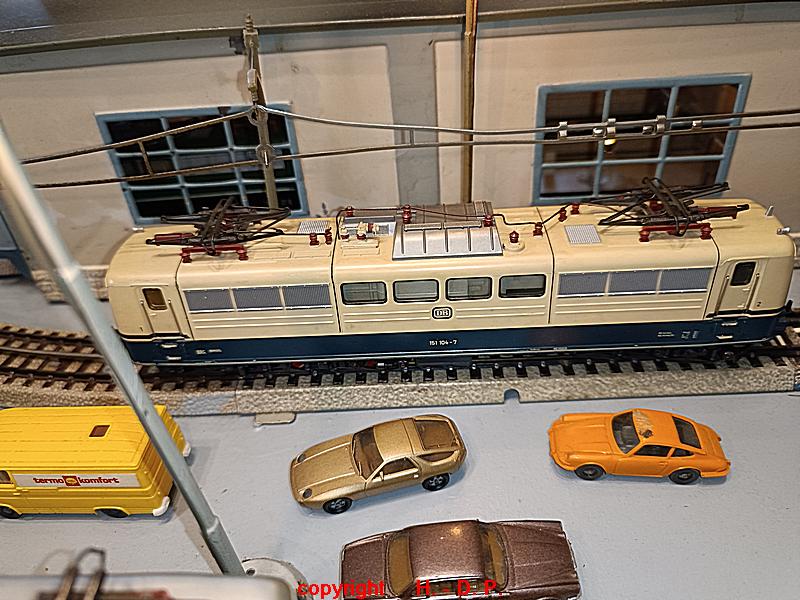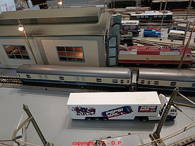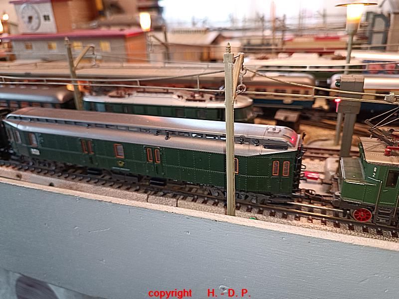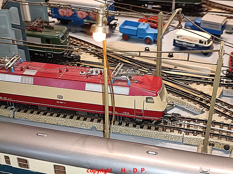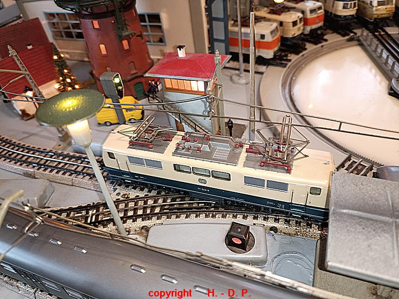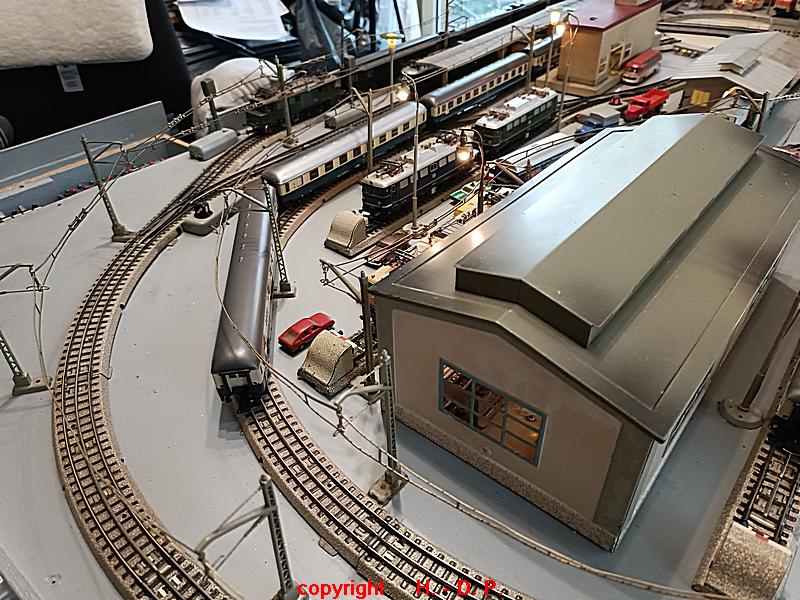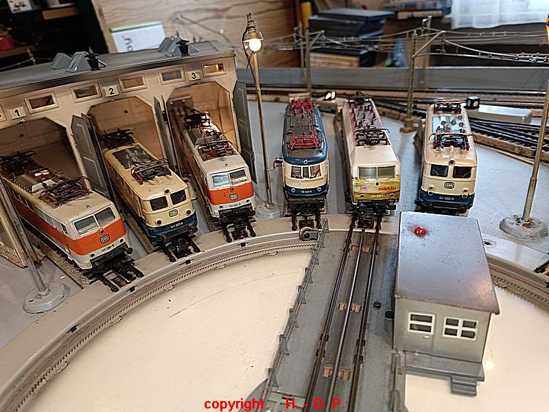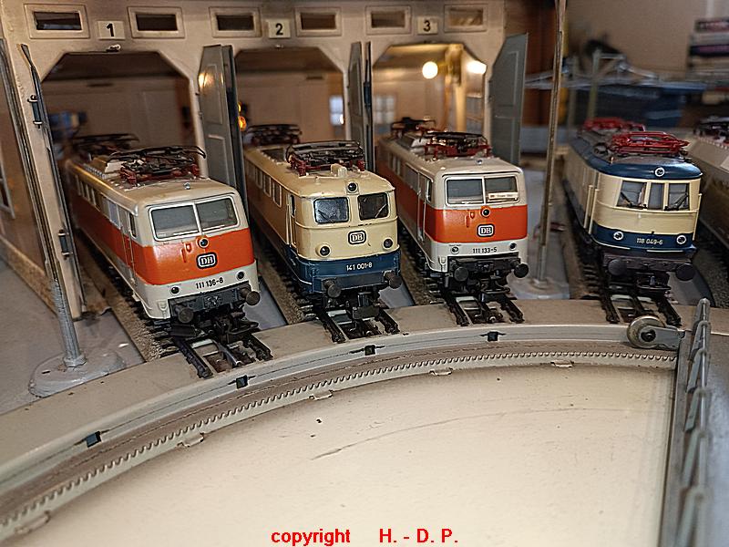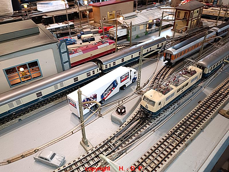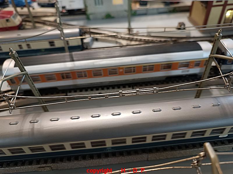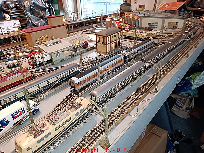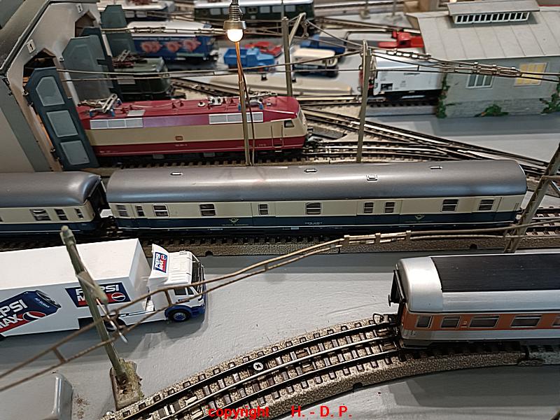 Zu sehen gab es meine Roco Wagen, wie die Hechte der DB, Mitteleinstiegswagen und Wagen in ozeanblau / beige und diese Wagen wurden gezogen von einer Märklin BR 104, BR 118 und einer BR 111. In den beidenLokschuppen standen natürlich auch noch andere Märklin Loks und auf den Abstellgleisen noch 2 x 2 Roco D - Zugwagen.