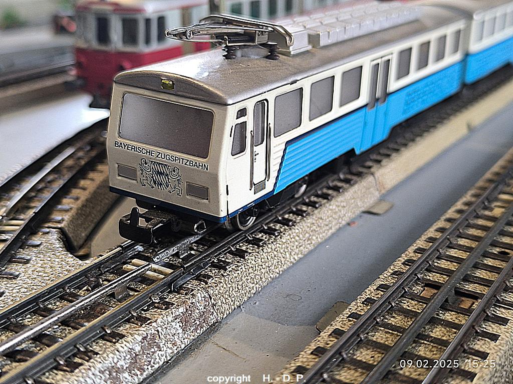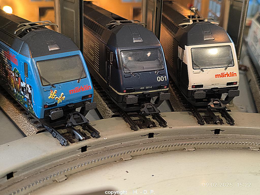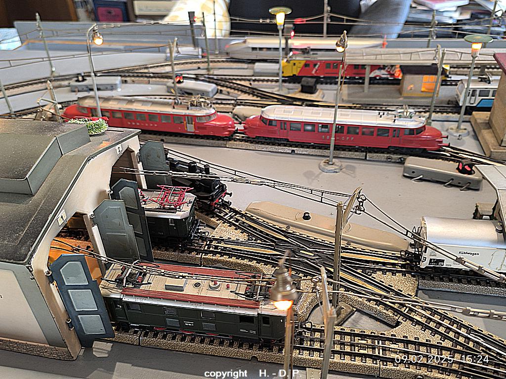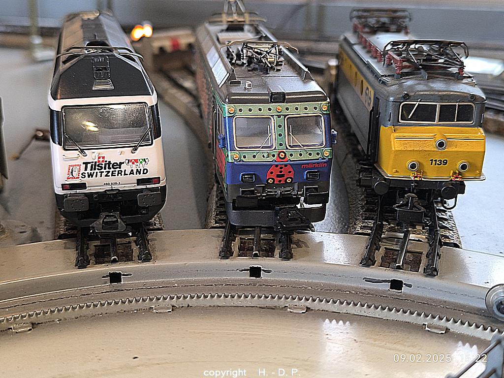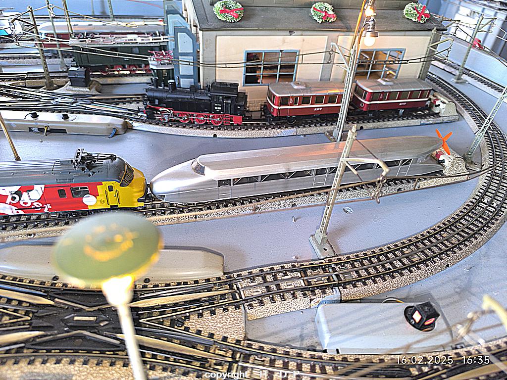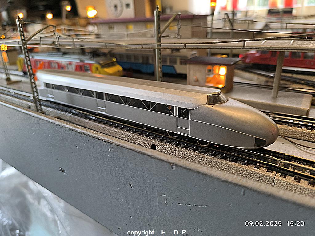 Von der Firma Hag, ein roter Pfeil und ein Trieb - mit Steuerwagen, von Märklin ein roter Pfeil, Ein Schienenzeppelin, ein Posttriebwagen der NS und von Primex die Bayerische Zugspitzbahn. In den Lokschuppen gaben sich 5 Schweizer E - Loks, eine Lok der NS und von der DB 1 x E 44.5 und eine E 32 die Ehre