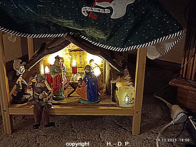 die Krippe findet nun unter dem Baum ihren Platz und die ist mit 5 kabellosen Kerzen beleuchtet