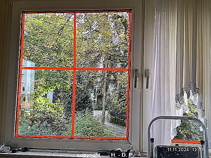 ![]() dann werden die Scheiben mit rotem Klebeband abgeklebt |