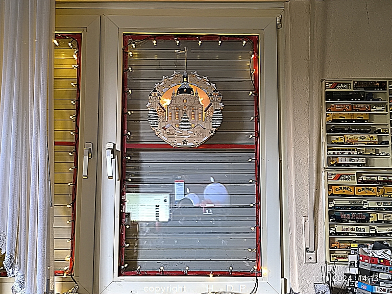 ![]() die Holzbilder hängen und auch die Weihnachtsbaum Kerzen kleben an der Scheibe |