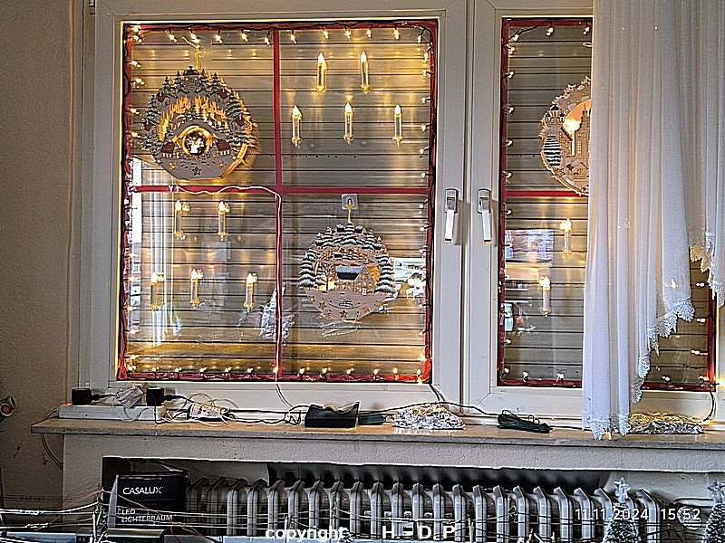 Doch bevor es ans Dekorieren ging mußten natürlich erst einmal die Fenster geputzt werden. Nach dem Putzen wurden die Scheiben mit rotem Klebeband abgeteilt und dann die Lichterkette an die Scheiben mit Tesa geklebt. Dann folgten die Holzfensterbilder die mit den so genannten Magischen Haken an den Scheiben befestigt wurden. Zum Schluß wurden wieder die alten Videokassetten, wovon ich zum Glück noch reichlich habe, auf die Fensterbank gelegt und darauf kamen dann ein Holzstern, ein kleiner Schwibbogen aus Kunststoff mit einer Wasserfüllung in der es dann schneit und eine Tanne uch mit Glitzerwasser gefüllt. Dann mußten natürlich noch die Kabel und Steckdosen Leisten verdeckt werden, was mit einem festen Papier von einer Rolle gemacht wurde.