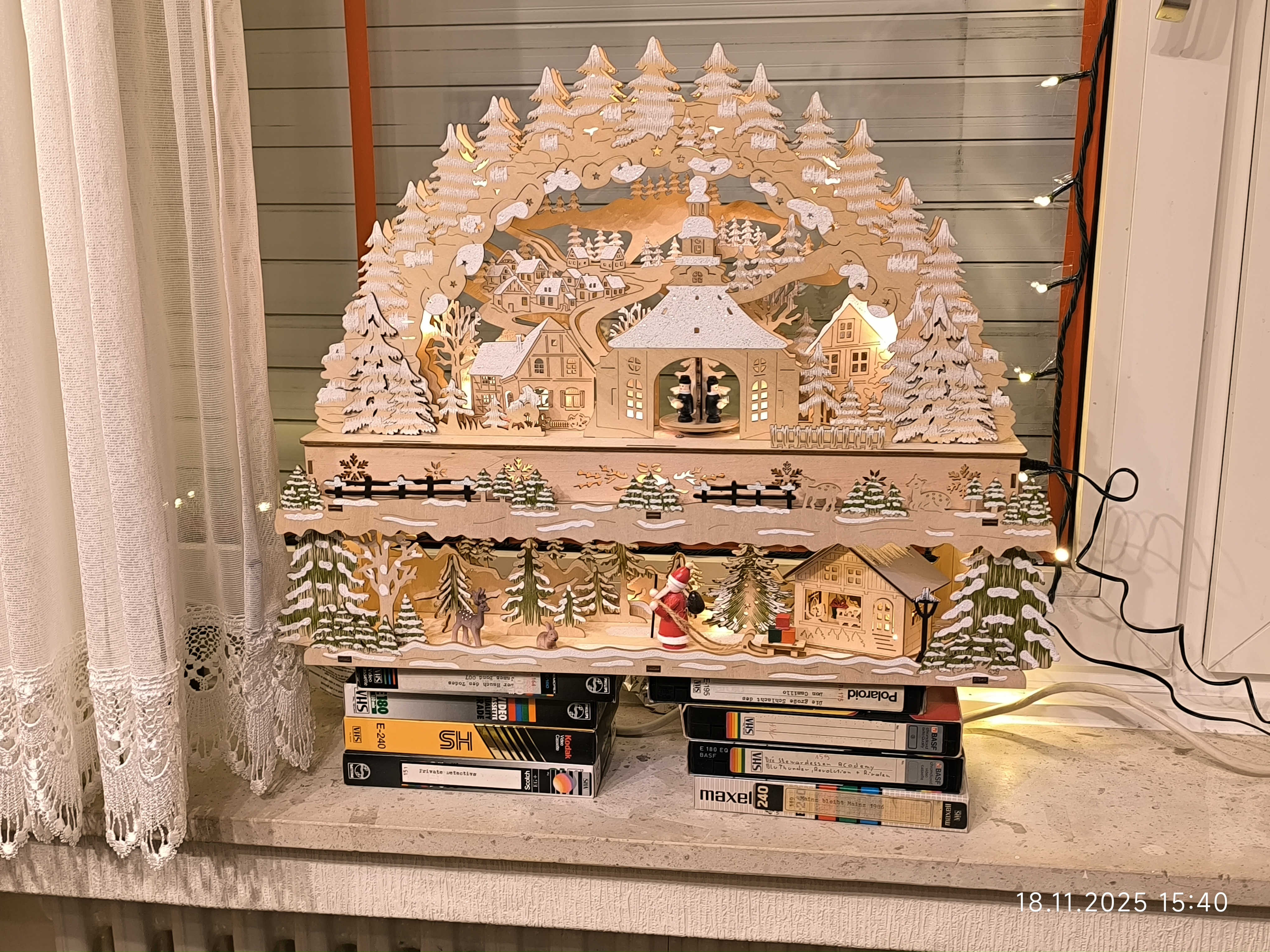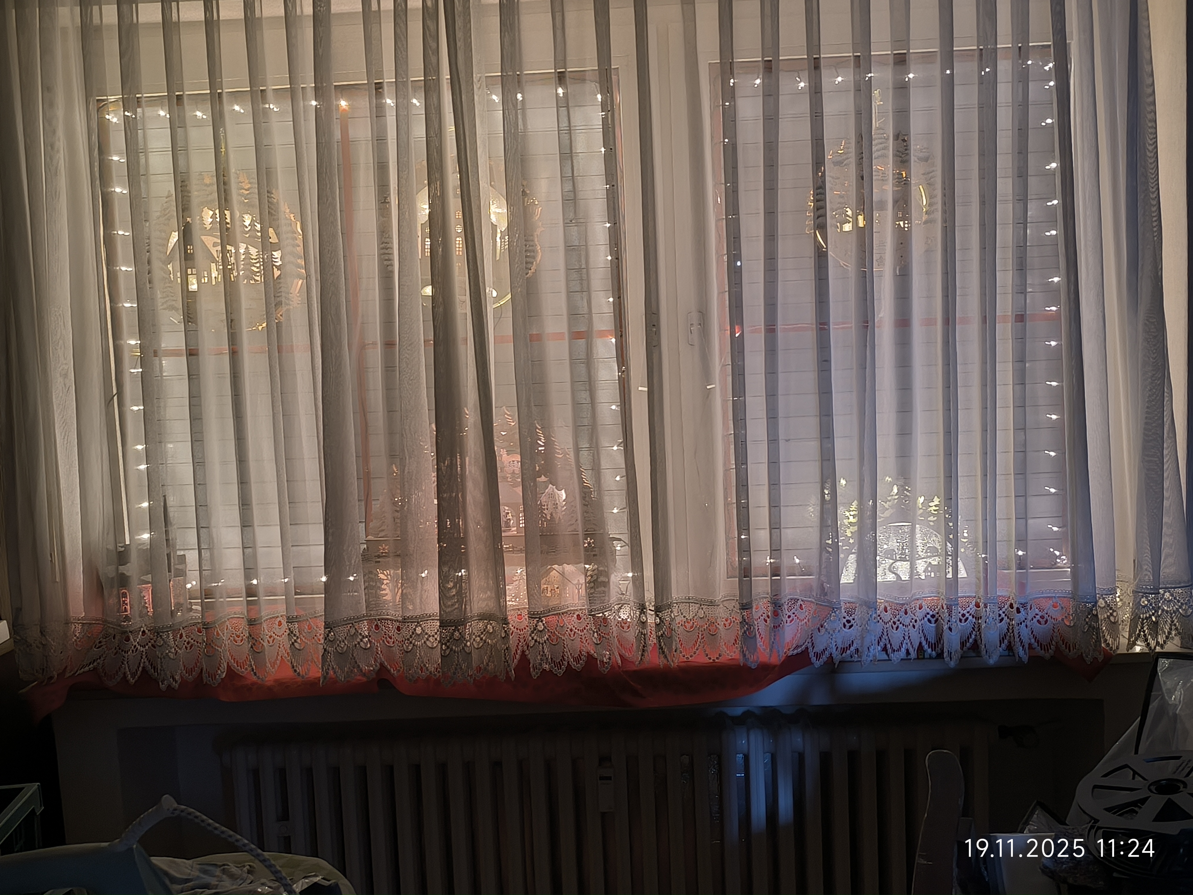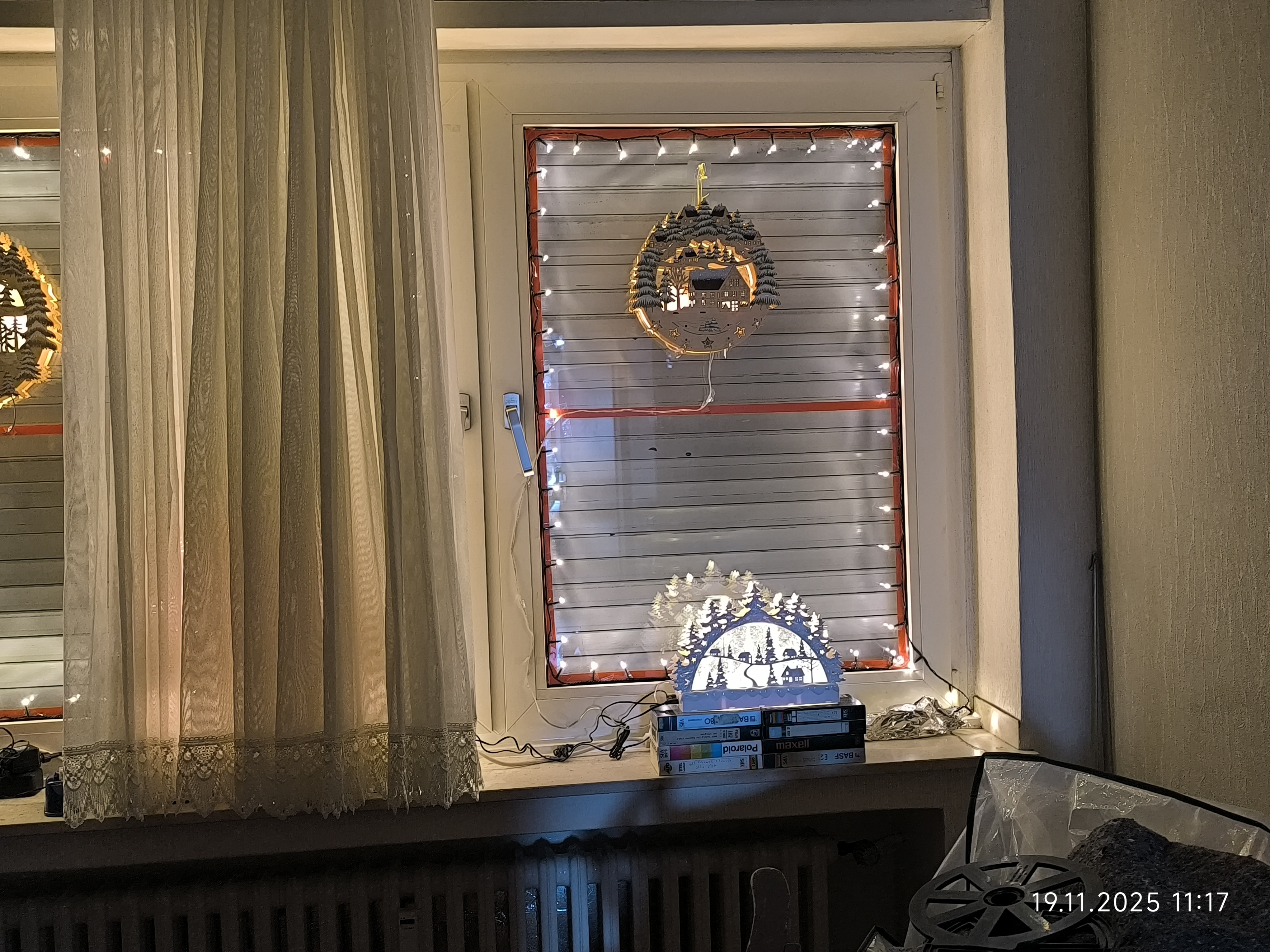 Am Dienstag den 18.11.2025 ging es mit dem Fenster des ehemaligen Kinderzimmer weiter. Zuerst kam das Fensterputzen, dann die Scheiben abkleben und dann ging es mit Lichterketten und den Holzfensterbildern weiter. Auch ein größerer Schwibbogen mit Unterbau fand noch seinen Platz auf der Fensterbank und auch noch ein kleiner Schneewasser Lichterbogen. Auch eine kleine beleuchtete Keramik Kirche fand noch ihren Platz.