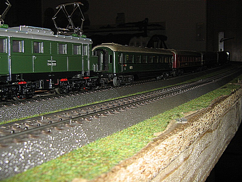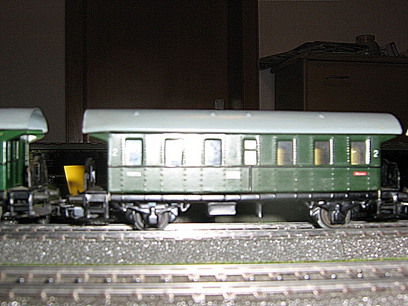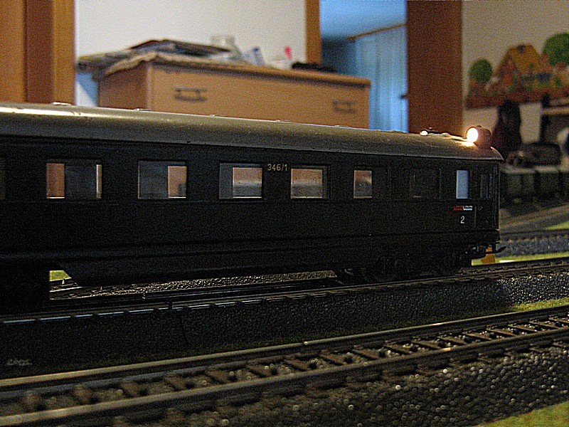 Der zweite Zug war ein Schnellzug aus dem Jahre 1954, Leider nicht mit der Original Lok sondern mit der E 44 Nr. 3011 Bj. 1966 - 1967. Als Wagen kamen zum Einsatz die alten Schürzenwagen der Serie 346 und zwar 1 x 346/1, 1 x 346/3, 1 x 346/3J, 1 x 346/5 und 1 x 346/1. Alle Wagen stammen aus den Jahren 1951 - 1952. Was mich persönlich gewundert und gleichzeitig sehr gefreut hat, ist das der Wagen mit dem Schlußlicht auch nach 54 Jahren immer noch brennt. Auch bei diesem Zug kam wieder das "selige Modellbahnlächeln "auf mein Gesicht. Nach einigen Runden ging zu meiner großen Überraschung noch das Licht in dem Postwagen an.