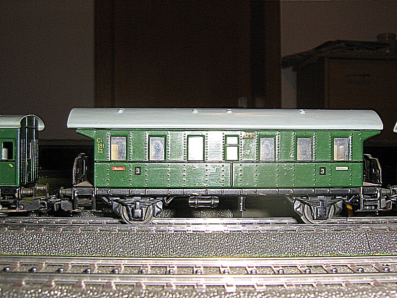 Nach einigen Berichten im Stummi Forum über alte Modelleisenbahnen, habe ich heute einmal versucht Züge mit Material der 50er Jahre zusammen zu stellen. Der erts Zug ist im Märklin Katalog von 1951 auf der Seite 15 zu sehen. Die Lok ist eine RM 800 also der Vorgänger der FM 800 und später 3003.Als Wagen kamen zum Einsatz die Fahrzeuge mit der Artikelnummer 329/1, der späteren Nummer 4002 und ein Gepäckwagen 329/4 später 4003.