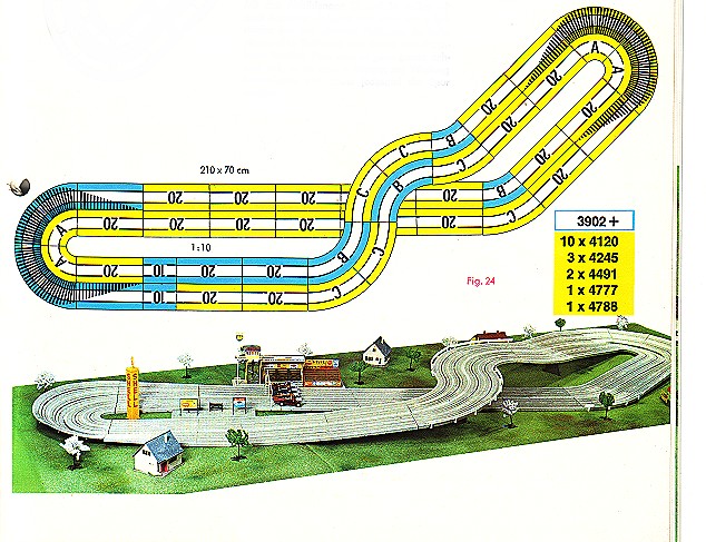 Das Modelljahr 1973/74 bringt leider so gut wie nichts neues. Im Katalog sind nur fast keine Bilder zu fonden, in der Preisliste dagegen steht einiges mehr drin aber ohne Abbildung. Neu war nur die Startpackung 3904 Rennen mit neuen Autos und einer roten Steilwandkurve.
