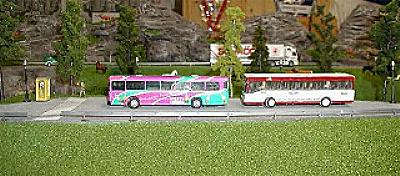 der rechte Bus ist ein Eigenbau nach dem Vorbild der DVG Duisburger Verkehrs Gesellschaft für das Faller car system