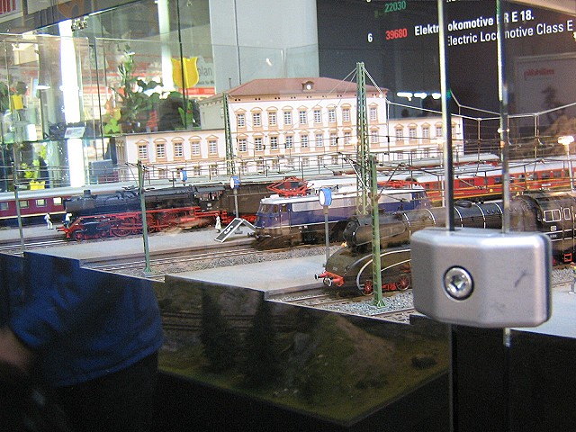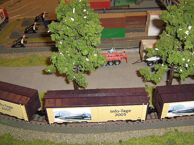 Ein Big Boy zog seine Runde mit ca. 50 Wagen mit der Aufschrift "Info Tage 2005". Zu dem Schienenbus ist zu sagen, das der wohl aufgemalte Steg zwischen den Frontscheiben am Modell kaum auffällt, wenn man es nicht weiß. Auf einigen Bildern aus dem HAuse Märklin sieht das sehr unschön aus, aber am Modell istv es kaum bis gar nicht mit dem bloßen Auge zu sehen.