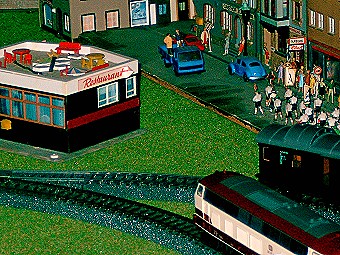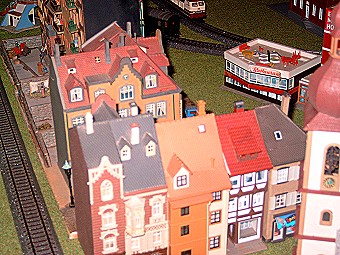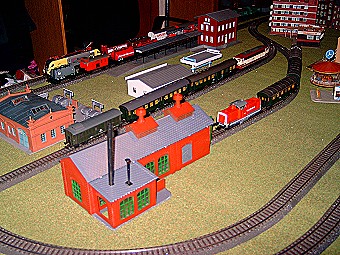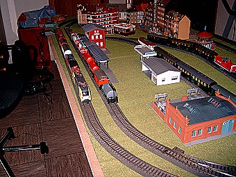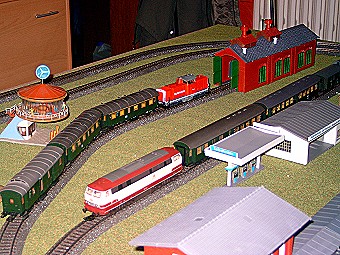 Dann wurden ein Bahnhof ein Bahnsteig, Lokschuppen und einige Häuser aufgestellt und fertig ist meine Spielanlage. In den nächsten Tagen werde ich mir die noch fehlenden Gleisstücke zulegen, so das der Gleisplan dann etwas besser für das Auge aussehen wird.