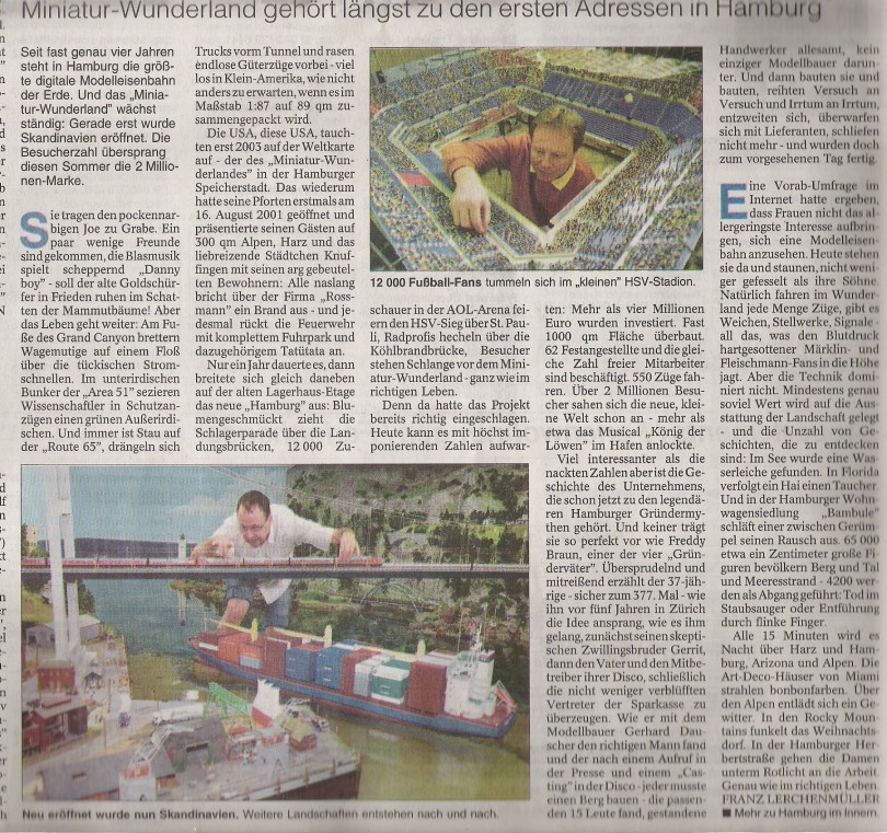 Heute, am 27.07.2005, war in der Tageszeitung NRZ = Neue Ruhr Zeitung in der Mittwochsbeilage REISE JOURNAL ein Bericht über das Miniatur Wunderland in Hamburg. Diesen Bericht möchte ich natürlich allen Freunden der kleinen Bahn nicht vorenthalten. Ich hoffe es ist noch lesbar.