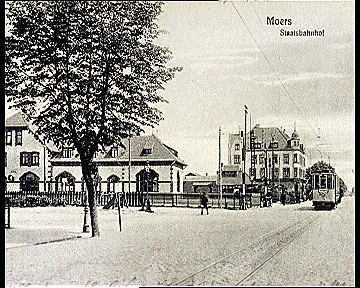 Die alte Grafenstadt und ehemalige Kreisstadt Moers erhielt erst im Jahre 1904, mit der Eröffnung der Strecke Duisburg - Kleve, ihren Bahnanschluß. Aus dieser Zeit stammt auch der heute noch erhaltene Bahnhof, der aber früher ebenerdig angelegt war mit einem Bahnübergang an der Hombergerstraße. Der Grund für diese Bahnstrecke war, die Arbeiter schneller an die Arbeitsplätze zu bringen.