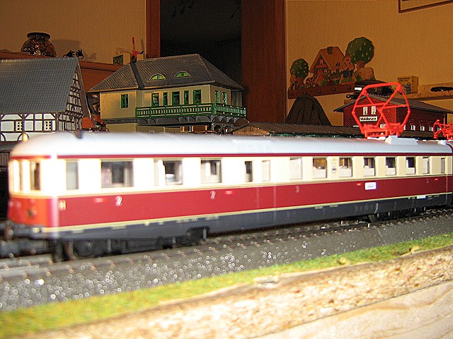 Der ET 25 fährt auch nicht schlecht, aber es ist kein Vergleich mit der E 40 oder auch dem ET 420 von Röwa. Der Zug hat keine Haftreifen und ist sehr leicht, was sich schon bei der kleinsten Unebenheit negativ bemerkbar macht. Die Räder drehen durch und der Zug bleibt fast stehen. Ich muß mal sehen ob es da vielleicht eine Möglichkeit gibt um Haftreifen aufzuziehen. Der Zug ist sehr schon detailiert und es sind noch einige Zurüstteile anzubringen, was ich aber noch nicht gemacht habe. Auch fehlt noch eine Innenbeleuchtung, die aber in kürze von einem Mitglied unseres MIST 47 eingebaut wird. Was sehr positiv ist, das ist die Stirnbeleuchtung. Sie wechselt von 3 x weiß auf 2 x rot. Diese roten Schlußlichter sind oben auf dem Dach, was auf den Bildern nicht so gut zu erkennen ist.