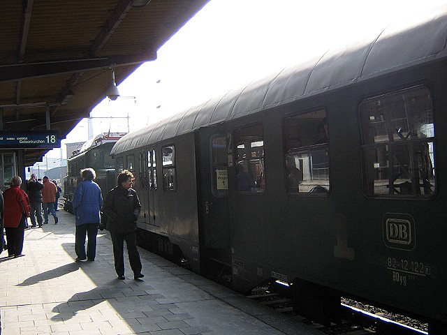 Es ging schon bei der Anreise zum Bahnhof los. Ich wollte in Duisburg Hbf zusteigen und meine Frau fuhr mich zum Bahnhof. Eine Fahrt, die unter normalen Bedingungen gerade einmal 10 Minuten dauert wurde aber zu einem Geduldsspiel. Die BAB A 40 war bereits an unserer Anschlußstelle Moers Ost dicht. Die Autos standen soweit man nur sehen konnte. Also nicht auf die BAB sondern Landstraße über Rheinhausen fahren. Nur war es hier auch nicht sehr viel besser, da viele Leute die gleiche Idee hatten. Doch lange Rede kurzer Sinn ich habe es mit hängender Zunge noch so eben geschafft. Als ich die Treppe zum Bahnsteig hochging, fuhr der Sonderzug gerade ein, aber für ein Foto mußte die Zeit noch reichen,also noch mal die Beine in die Hand nehmen und rein in den Zug und erst einmal ruhig Luftholen. Die Reise ging ja schon gut los.