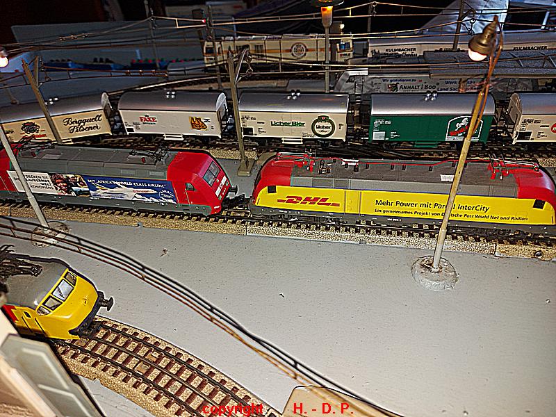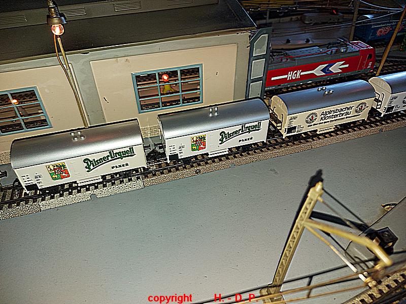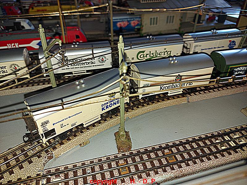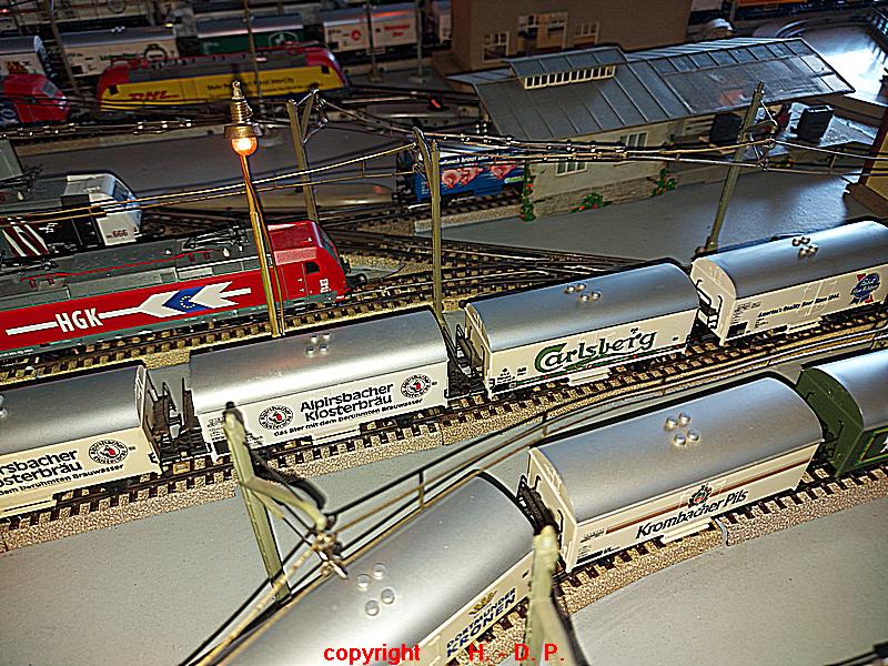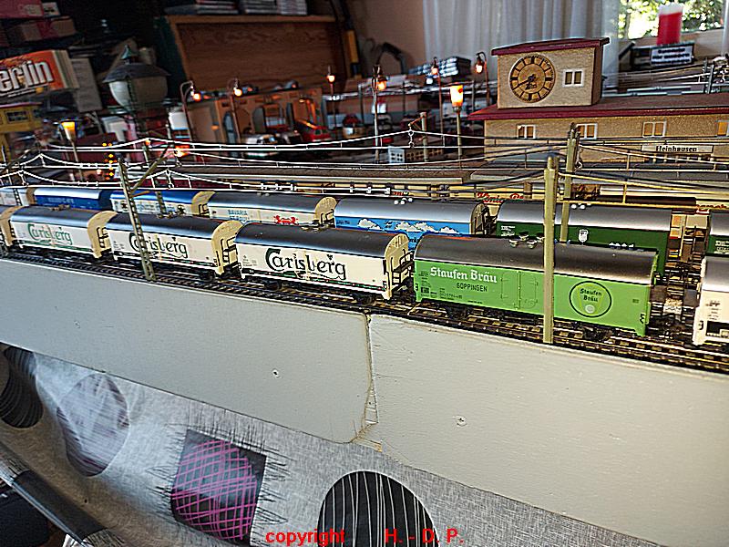 54 dieser Bierwagen stammen von Märklin und 2 von Fleischmann und die Loks stammen von Mehano, Märklin und Piko