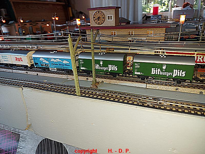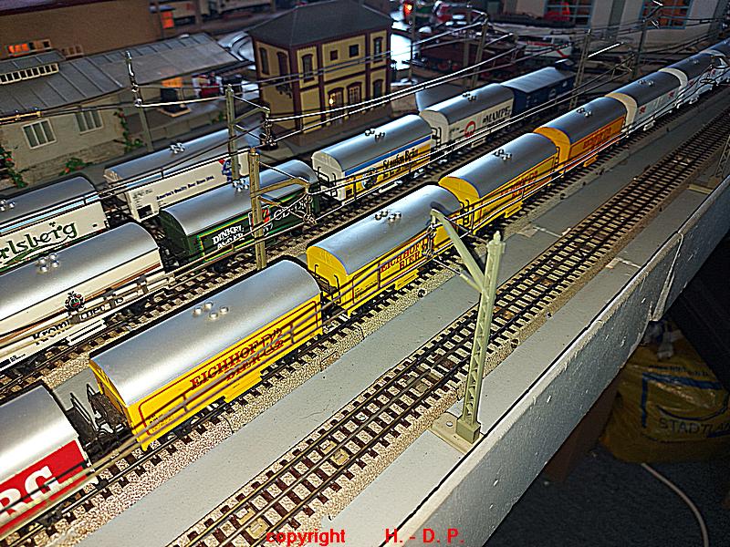 Heute steht mein Spieltag unter dem Motto " Bier her Bier her oder ich fall um " Jetzt werden wohl einige fragen was soll der Scheiß der alte Sack trinkt doch kein Bier. Ja das ist richtig, aber am letzten Freitag wollte ich alle meine Bierwagen mit zum MIST 47 nehmen und die da als langen Zug oder auch 2 Zügen fahren lassen, was aber leider nicht möglich war, da unser Hans - Gerd wegen dem schweren Unwetter nicht kommen konnte und ich meine Schienen nicht innerhalb von wenigen Stunden noch sortieren und reinigen konnte. Aus dem Grund habe ich jetzt einmal alle meine 56 Bierwagen in Heinhausen fahren lassen.