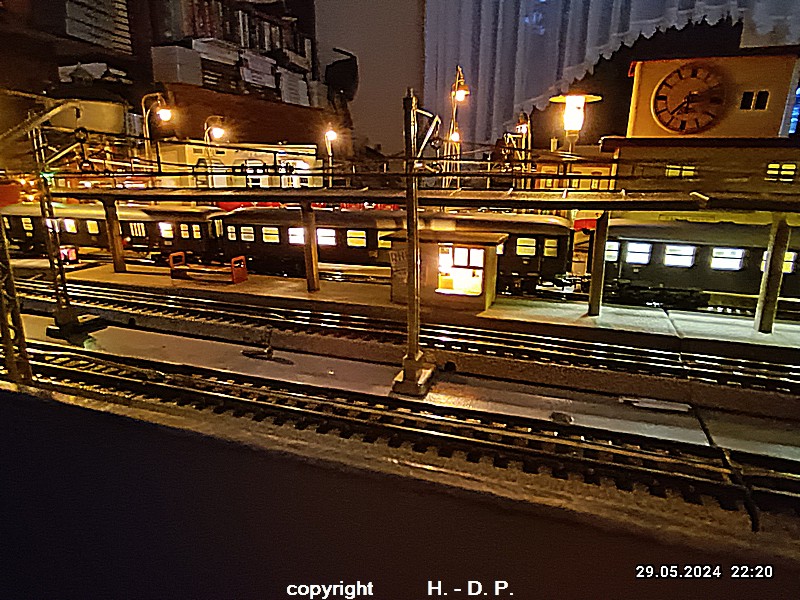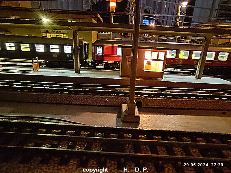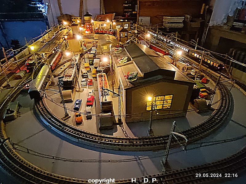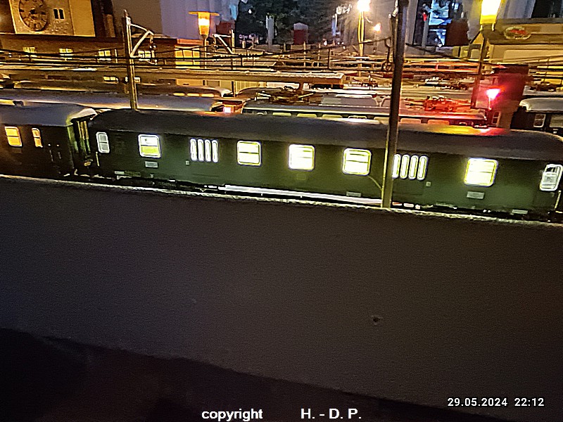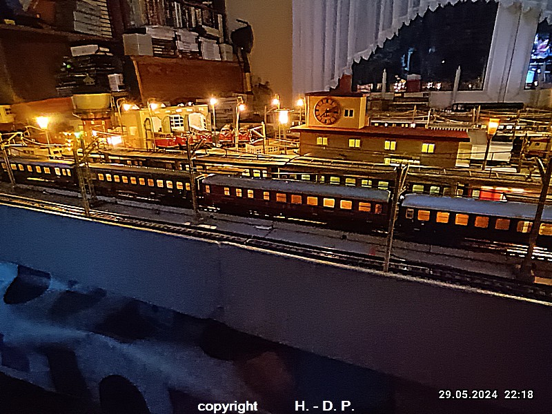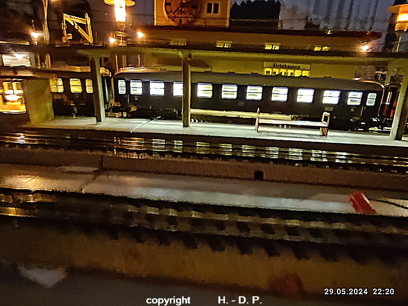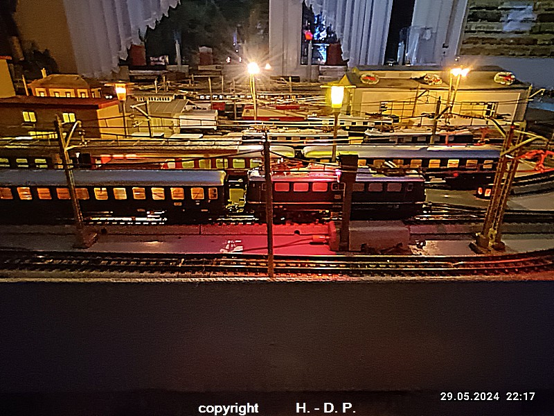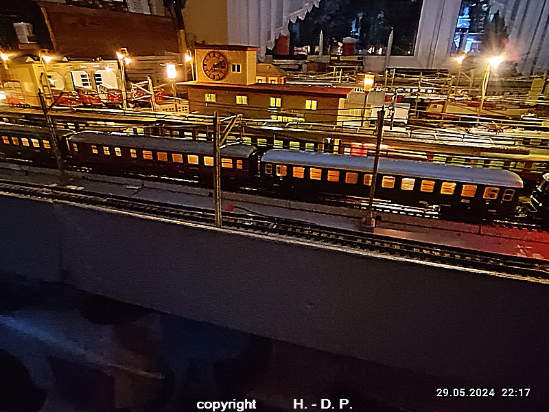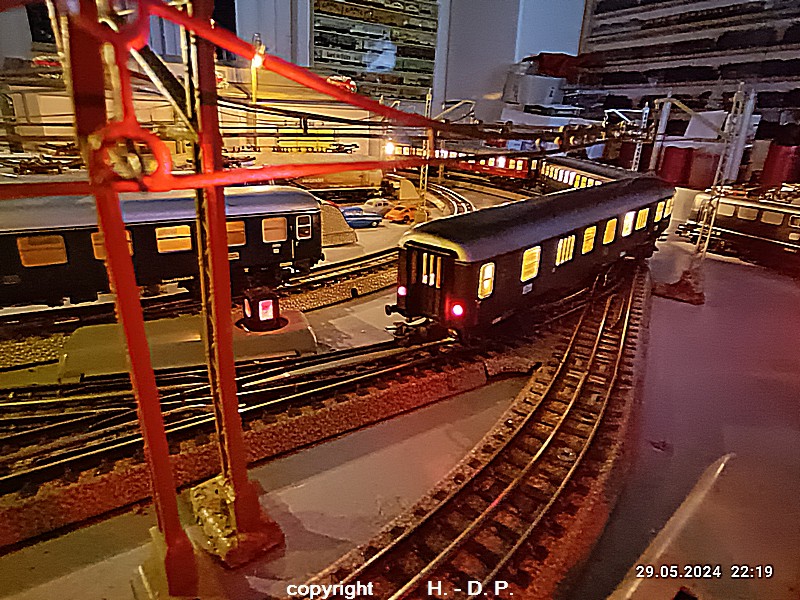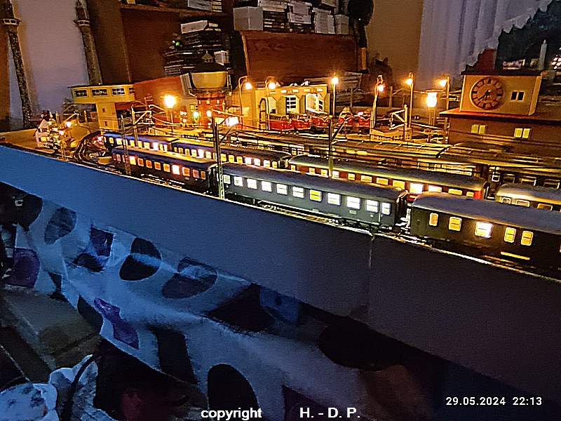 Der heutige Spieltag steht unter dem Motto "Heinhausen bei Tag und Nacht" Alle Loks und Wagen stammen aus dem Haus Märklin und die D-Zugwagen sind beleuchtete 24 cm Blechwagen, teilweise mit LED Birnchen in der Beleuchtungseinrichtung 7077.