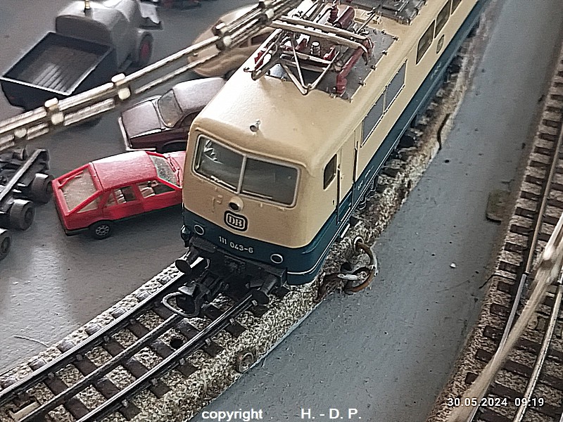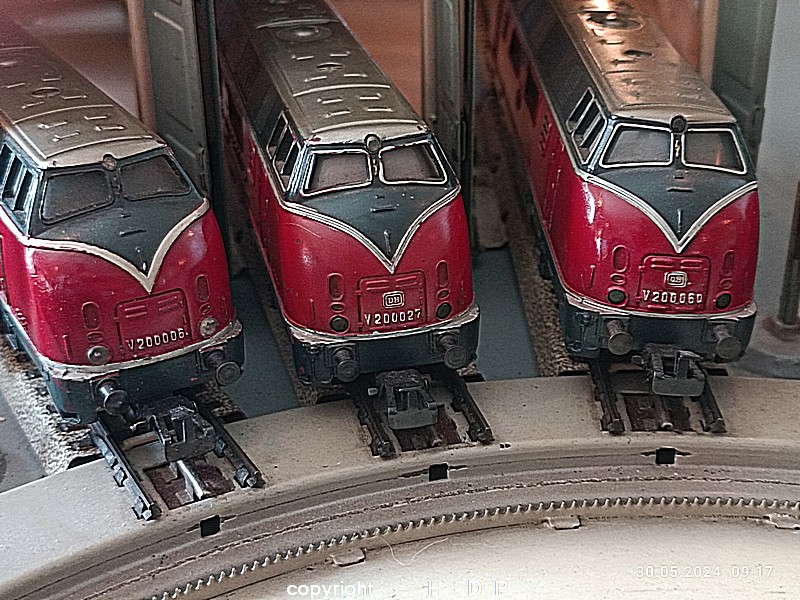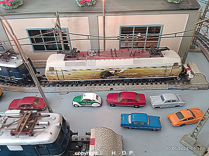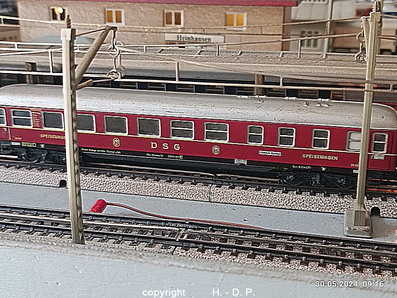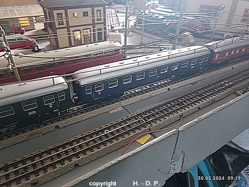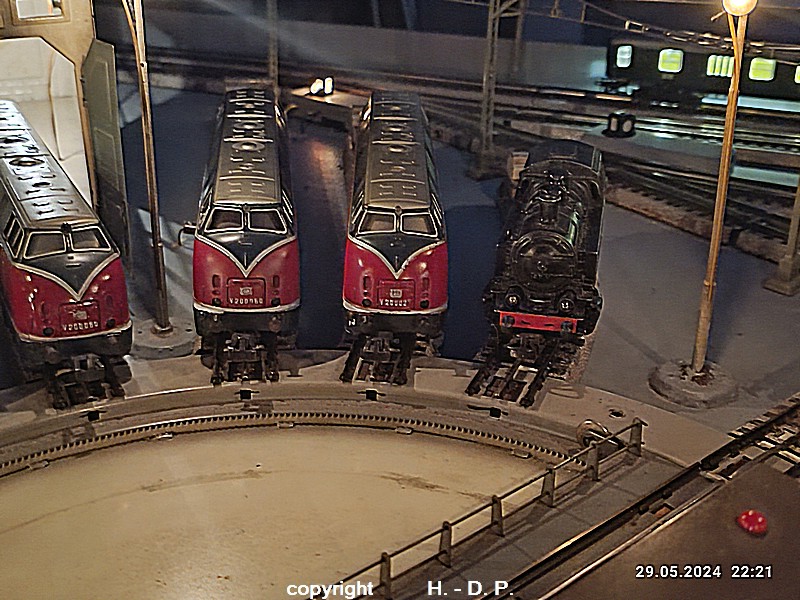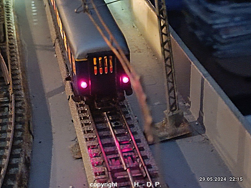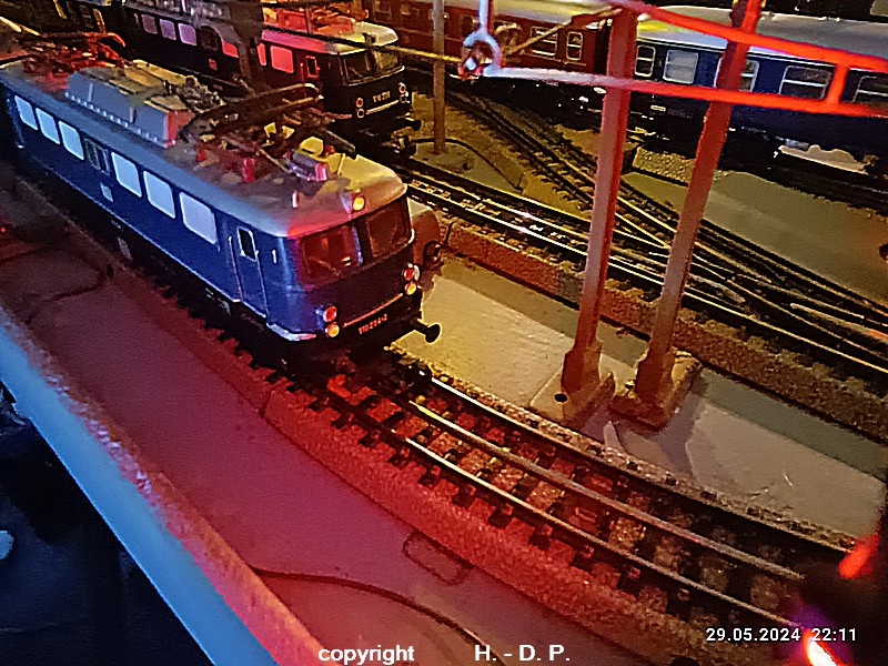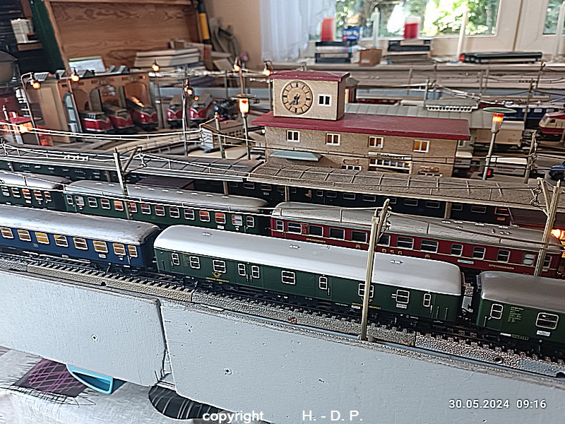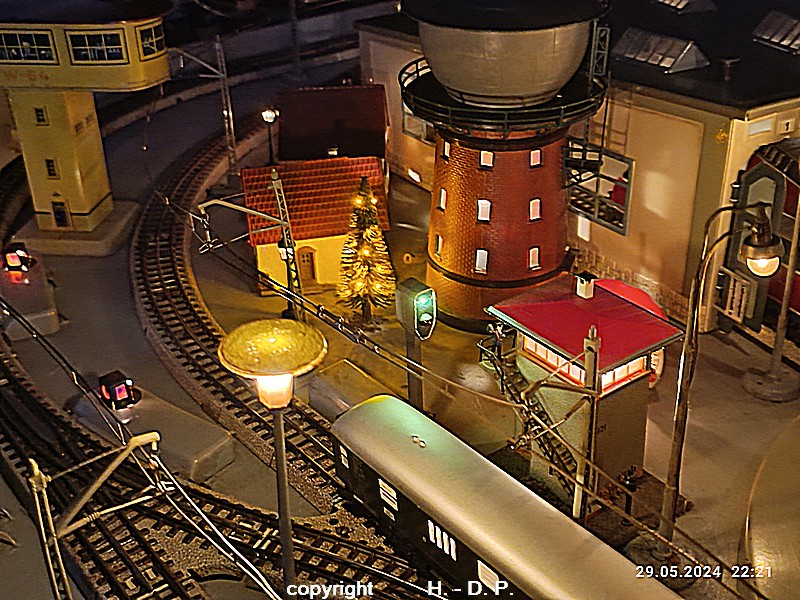 Der heutige Spieltag steht unter dem Motto "Heinhausen bei Tag und Nacht" Alle Loks und Wagen stammen aus dem Haus Märklin und die D-Zugwagen sind beleuchtete 24 cm Blechwagen, teilweise mit LED Birnchen in der Beleuchtungseinrichtung 7077.