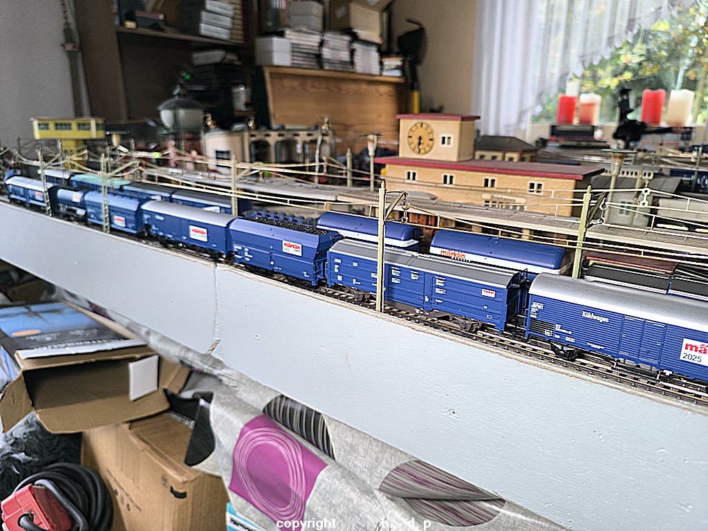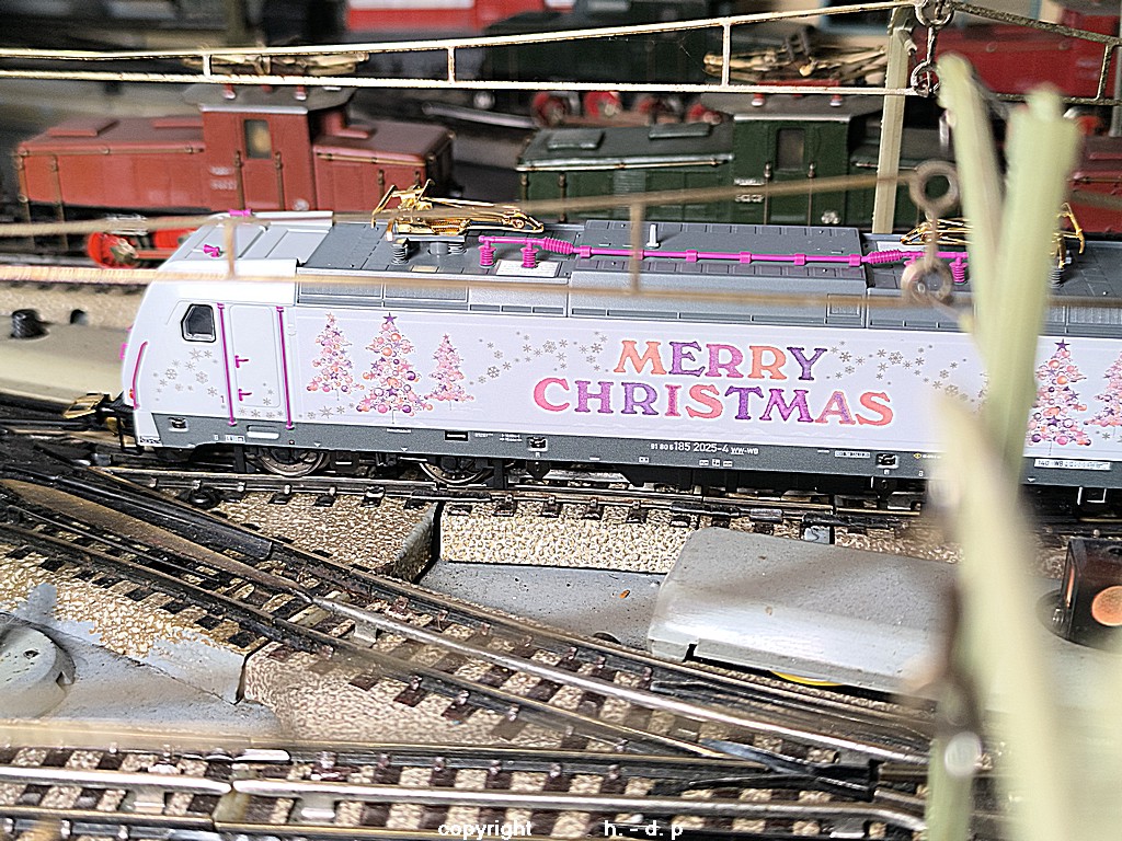 Die Weihnachtslok zieht heute noch einige MM Wagen, denn für Weihnachtswageni ist es noch einige Wochen zu früh, leider. Mir persönlich gefällt die MM Lok um einiges besser als die in meinen Augen etwas zu schlichte Weihnachtslok. Da ich bis heute 27 MM Wagen habe und meine Anlage nur 2,30 m lang ist, habe ich die Wagen auf 3 Züge aufgeteilt. Die meisten hängen hinter der neuen Weihnachtslok und die restlichen werden gezogen von der neuen MM Lok und der alten, das ist eine kleine BR 80.