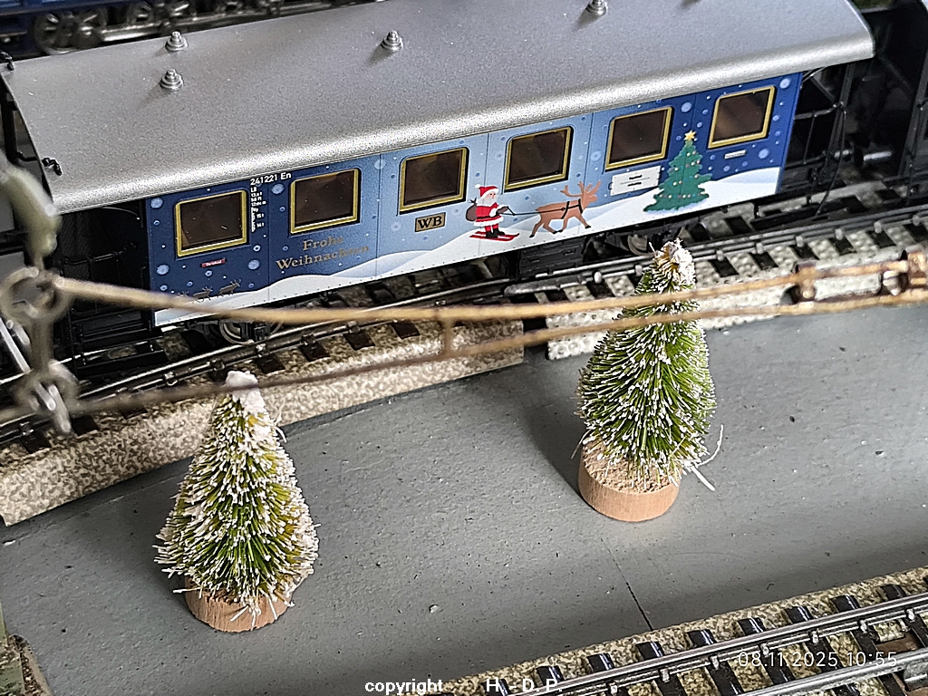 Es gehen geheimnisvolle Dinge in Heinhausen vor. Gesten habe ich doch tatsächlich eine kleine Dampflok mit 3 Personenwagen und einem Kesselwagen gesehen, die alle schon weihnachtliche Aufdrucke hatten. Dazu kam auch noch ein kurzer Güterzug mit der Dampflok BR 81, die auch schon im weihnachtlichen Glanz zu sehen war, außerdem konnte man einen offenen Güterwagen sehen der schon randvoll mit Geschenken war.