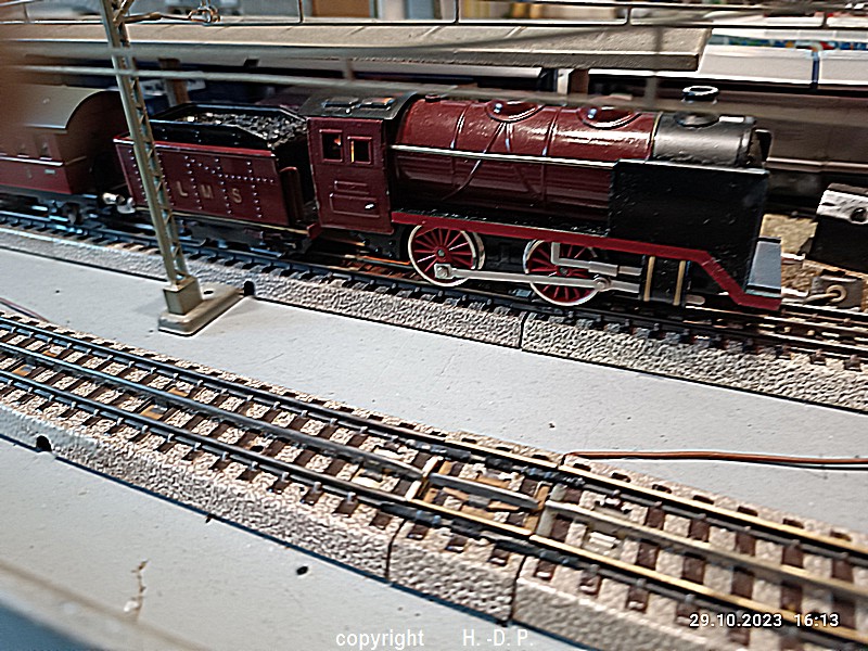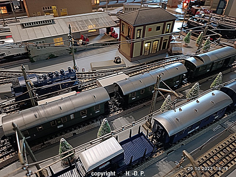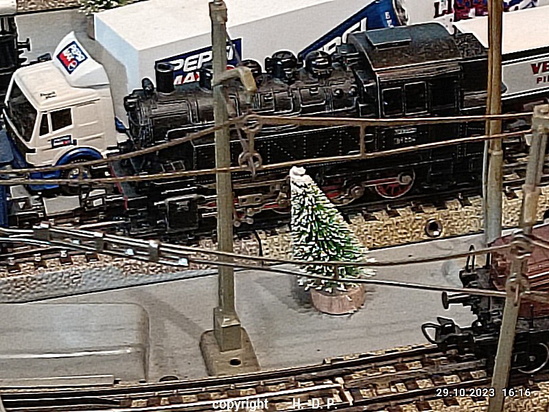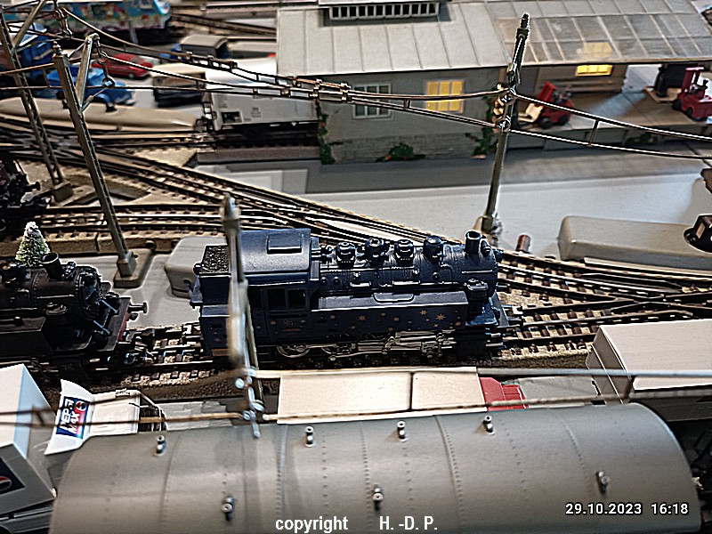 Der heutige Spieltag steht unter dem Motto "Allerlei im vorweihnachtlichen Heinhausen" Dazu habe ich mal einige Loks und Wagen au den Vitrinen, bzw. Stapelboxen genommen, die sonst nur selten bis fast gar nicht auf der Anlage zu sehen sind. Da dieser Spieltag ja schon in der Vorweihnachtszeit spielt, durfte natürlich auch die neue kleine umlackierte 3029, welche ich am letzten Freitag als Platzhalter für die neue Märklin Weihnachtslok von meinen MIST 47 Leuten erhalten habe, nicht fehlen. Ferner kamen noch zum Einsatz meine Märklin Magazin Wagen mit der Märklin Magazin Lok und später alle MM Wagen mit einer BR 50, die kleine Dampflok aus der Packung 0050 allerdings nicht in schwarz sondern in roter englischer Farbgebung als LMS Lok.