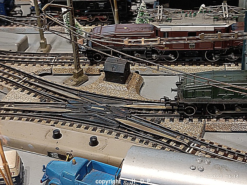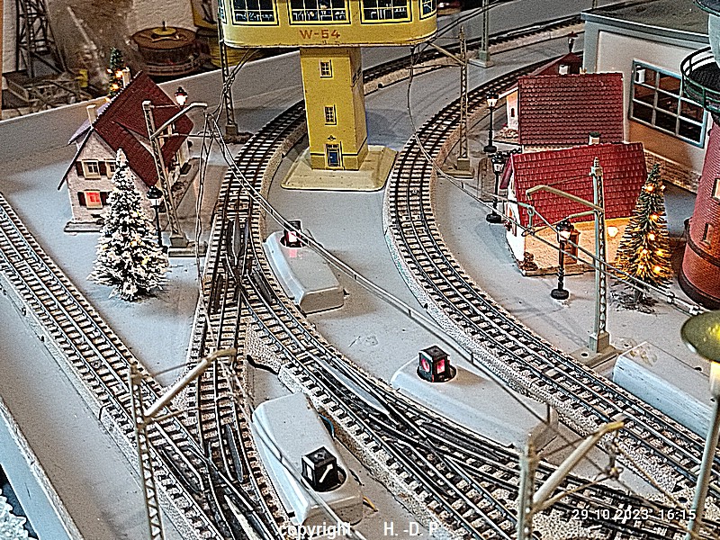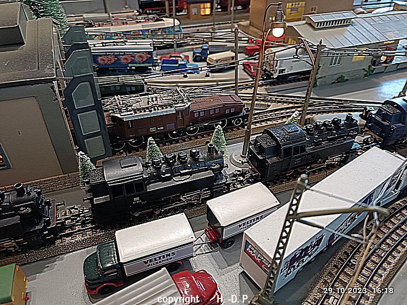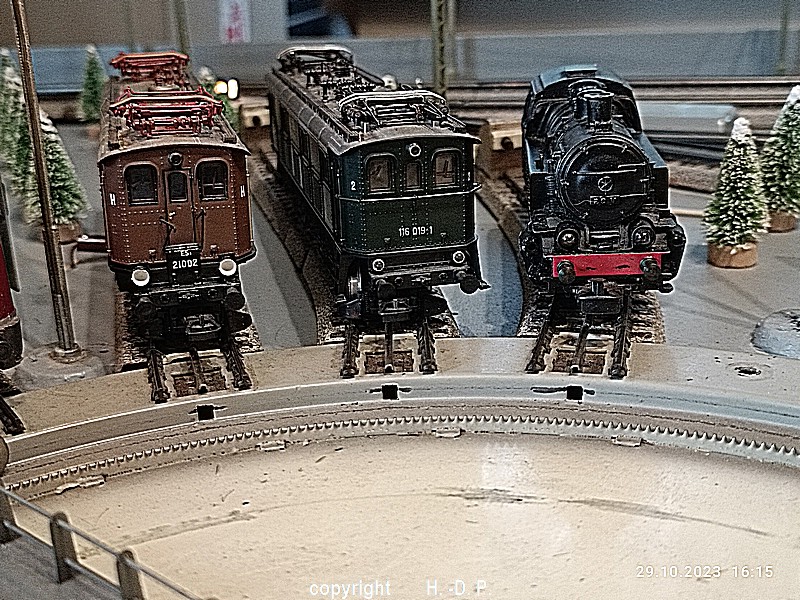 Dazu kam noch der kleine Kittel Dampftriebwagen mit 3 Güterwagen der Fleischindustrie und eine Lok der BR EP 2 der DRG mit neuen Donnerbüchsen aus der 4100 Serie. Alle Loks und Wagen stammen aus dem Haus Märklin. Diese Züge drehten ihre Runden im bereits heute vorweihnachtlich geschmückten Heinhausen.