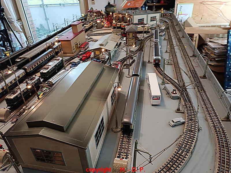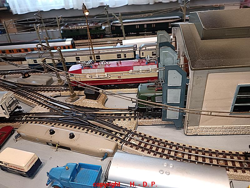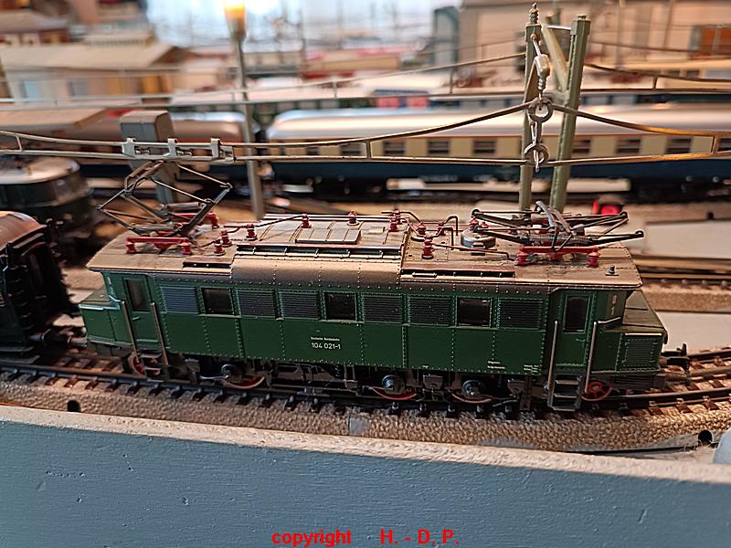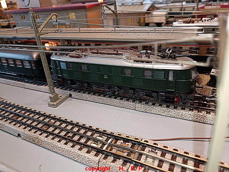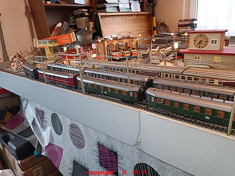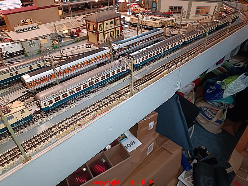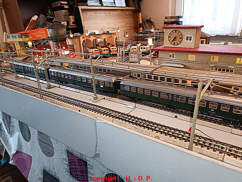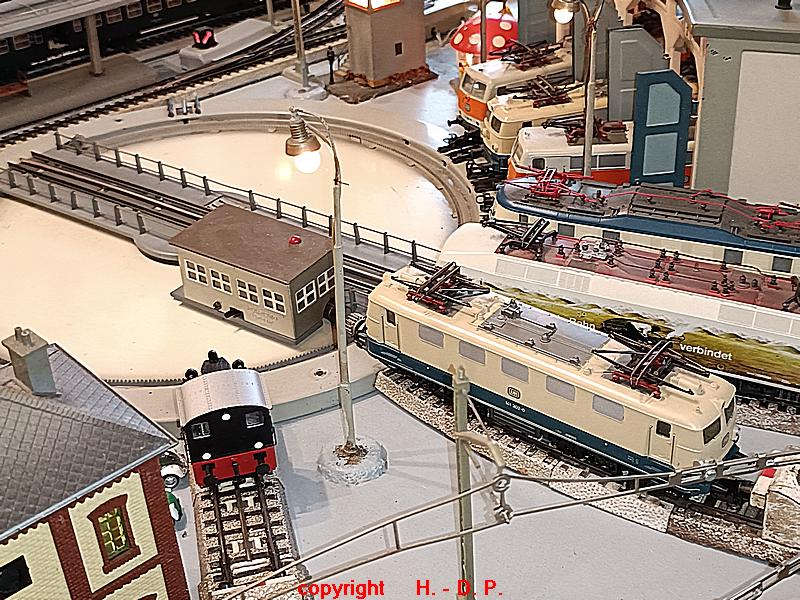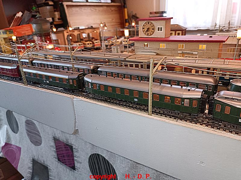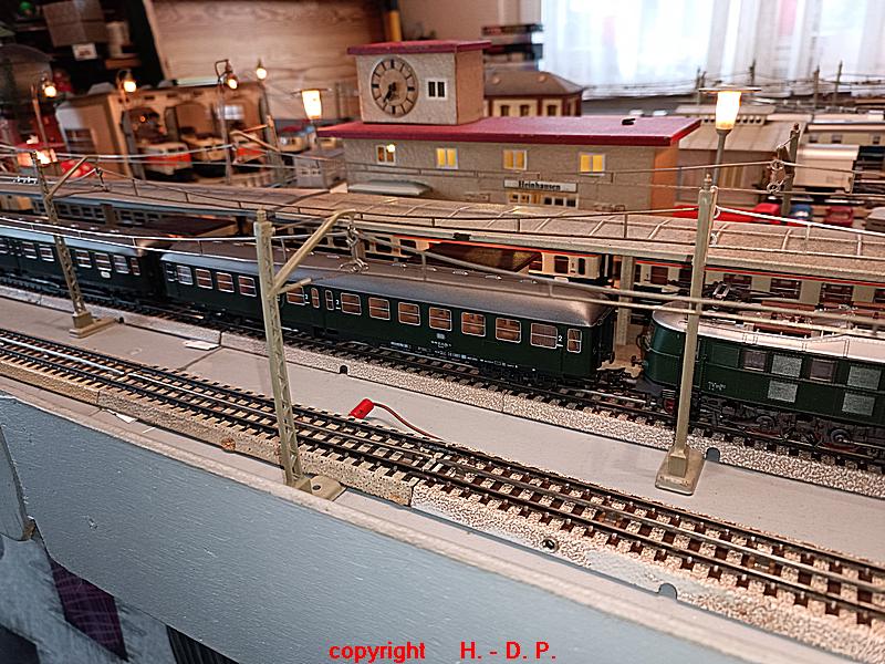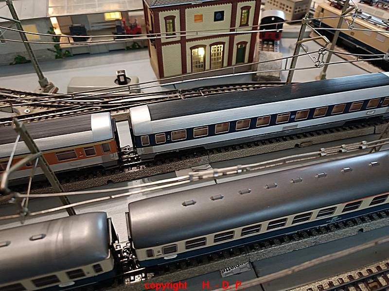 Zu sehen gab es meine Roco Wagen, wie die Hechte der DB, Mitteleinstiegswagen und Wagen in ozeanblau / beige und diese Wagen wurden gezogen von einer Märklin BR 104, BR 118 und einer BR 111. In den beidenLokschuppen standen natürlich auch noch andere Märklin Loks und auf den Abstellgleisen noch 2 x 2 Roco D - Zugwagen.