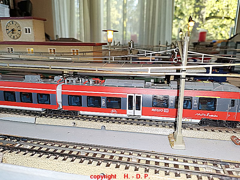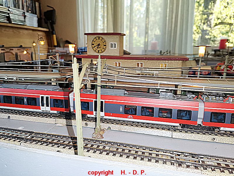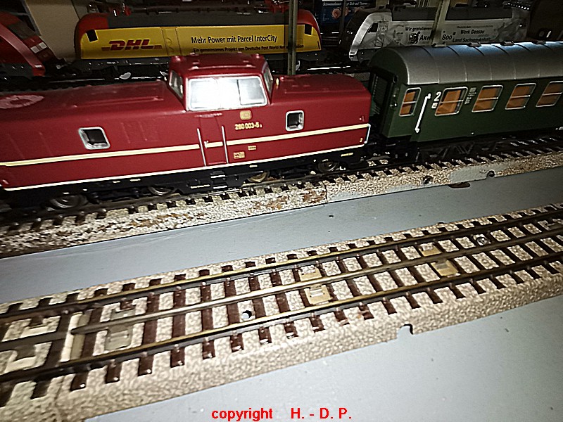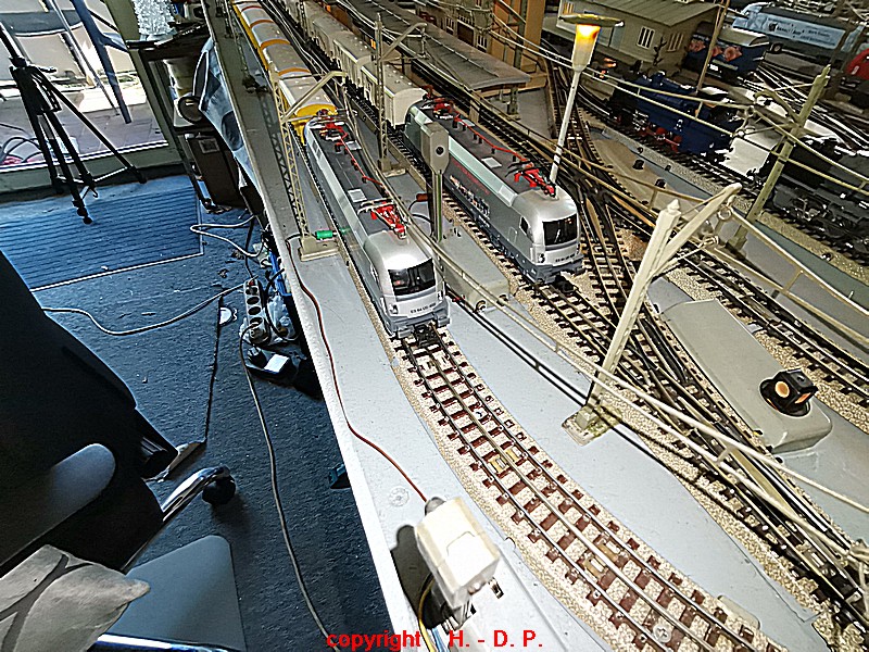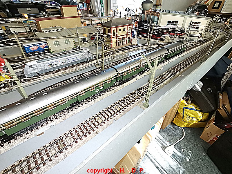 da waren auf der Anlage unterwegs ein Kühlwagen Zug gezogen von einem Piko Taurus, ein Bananenwagen Zug gezogen auch von einem Piko Taurus und die Wagen beider Züge haben sich gefruet über die poko Lok und die haben nicht die Nase gerümpft so wie einige andere Leute. Als Eilzug war auch noch der Märklin "Bamberger" der Zugpackung 26541