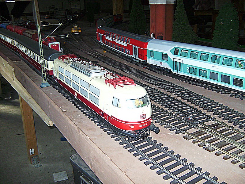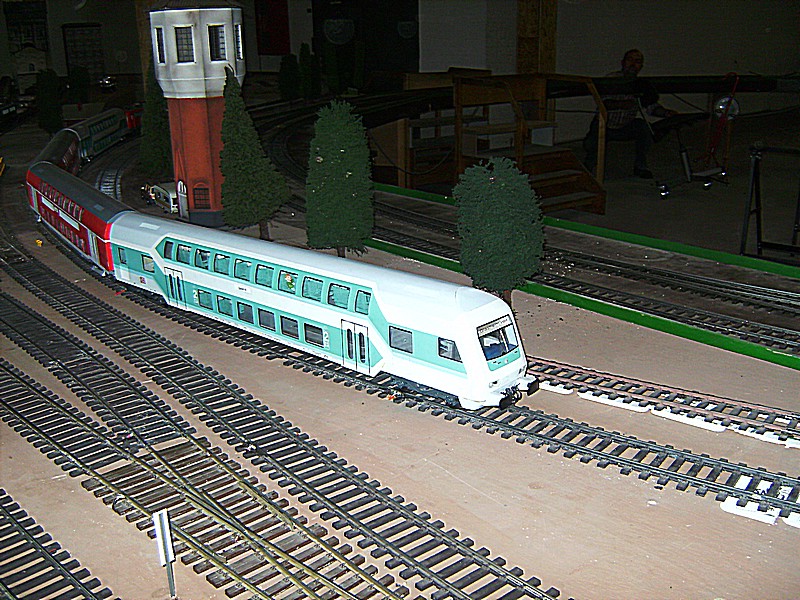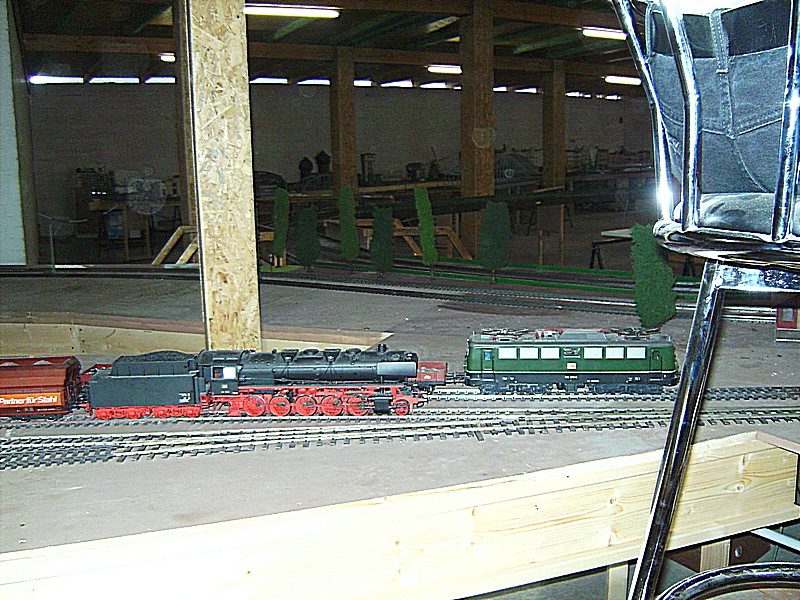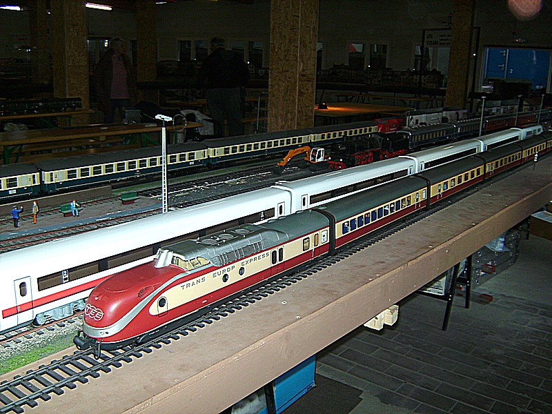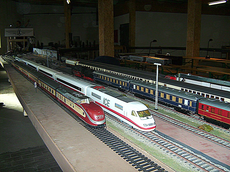 Beginnen möchte ich meine Anlagen Vorstellung mit der Spur 1 Anlage des Spur 1 Team Hagen. Im April, beim letzten BW Fest, war nur ein einfaches Oval fertig und heute in nur einem halben Jahr war die ganze Anlage fertig und konnte befahren werden. Es fehlt nur noch die Ausschmückung. Das was man heute sehen konnte verschlägt einem glatt die Sprache. Große Radien. lange Züge, das muß man einfach selber gesehen haben, einfach nur erste Sahne.