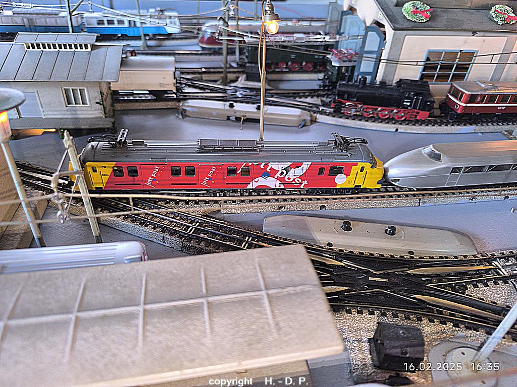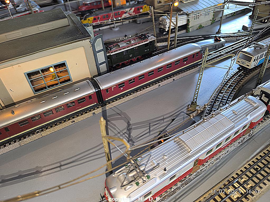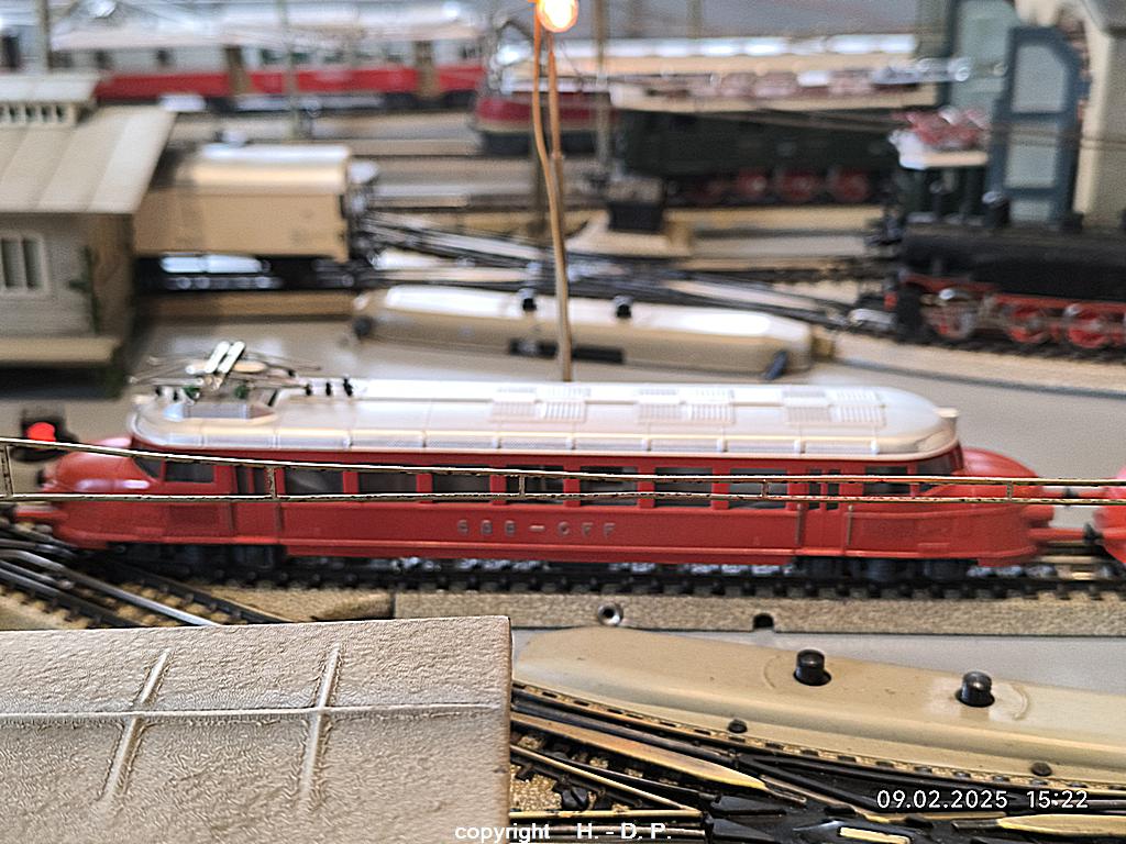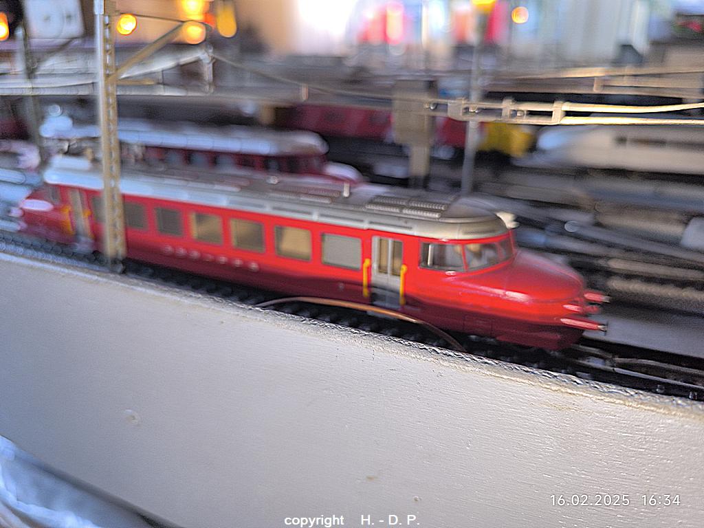 Von der Firma Hag, ein roter Pfeil und ein Trieb - mit Steuerwagen, von Märklin ein roter Pfeil, Ein Schienenzeppelin, ein Posttriebwagen der NS und von Primex die Bayerische Zugspitzbahn. In den Lokschuppen gaben sich 5 Schweizer E - Loks, eine Lok der NS und von der DB 1 x E 44.5 und eine E 32 die Ehre