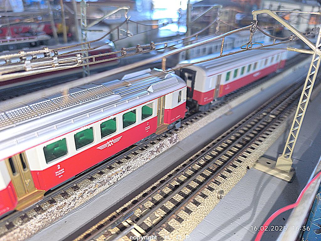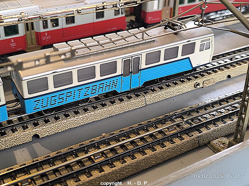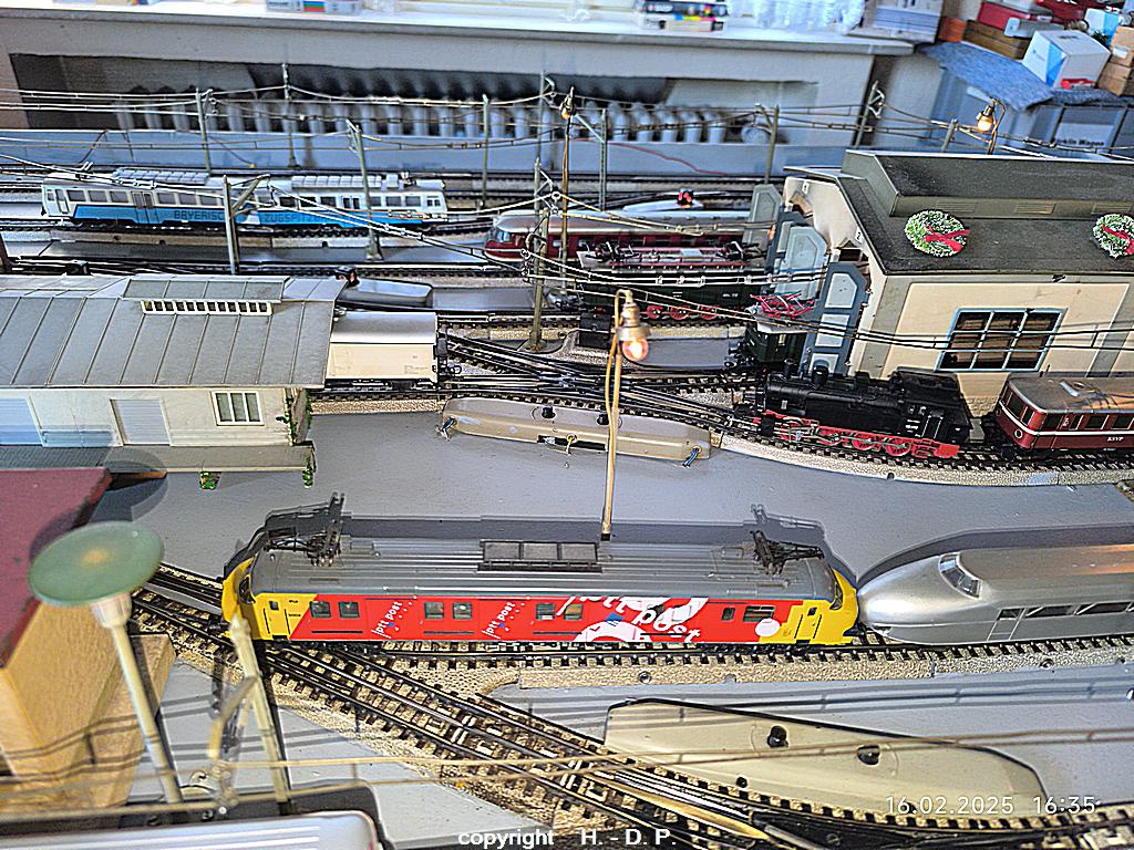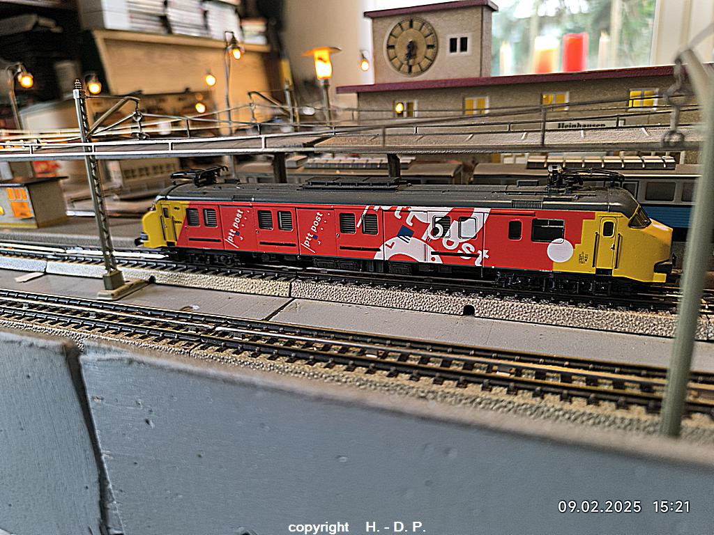 Von der Firma Hag, ein roter Pfeil und ein Trieb - mit Steuerwagen, von Märklin ein roter Pfeil, Ein Schienenzeppelin, ein Posttriebwagen der NS und von Primex die Bayerische Zugspitzbahn. In den Lokschuppen gaben sich 5 Schweizer E - Loks, eine Lok der NS und von der DB 1 x E 44.5 und eine E 32 die Ehre