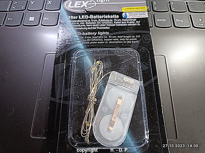 Vor einigen Wochen habe ich in einer Werbung solche Tannen , vor allen Dingen die großen, mit LED Beleuchtung gesehen und das gefiel einem Weichnachtsjeck natürlich sehr gut. Also habe ich nach einer kleinen Mini LED Kette gesucht und ich bin auch bei Ebay fündig geworden. Diese Kette hat 10 Mini LED`s und wird betrieben mit 2 Knopfzellen Ab 3 Stück kostet diese Kette 3,82 € und ich habe erst einmal 5 Stück bestellt.