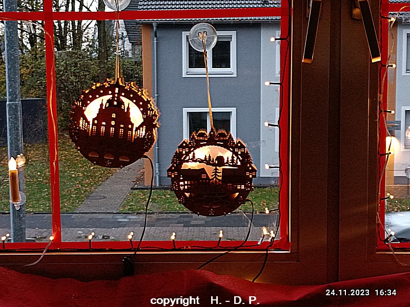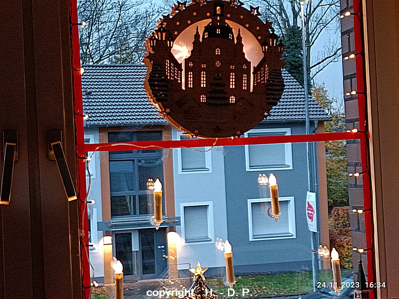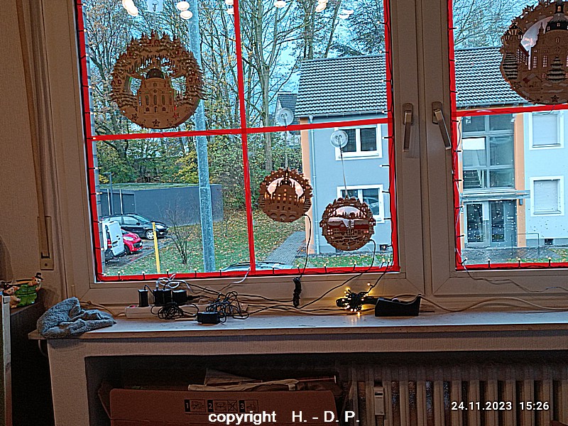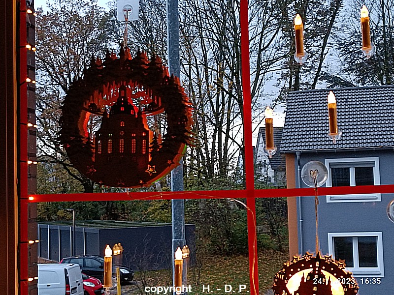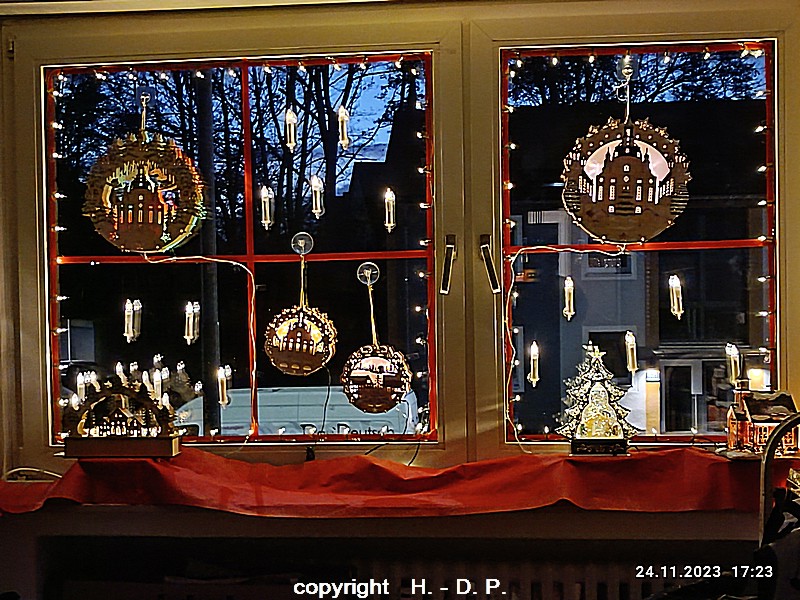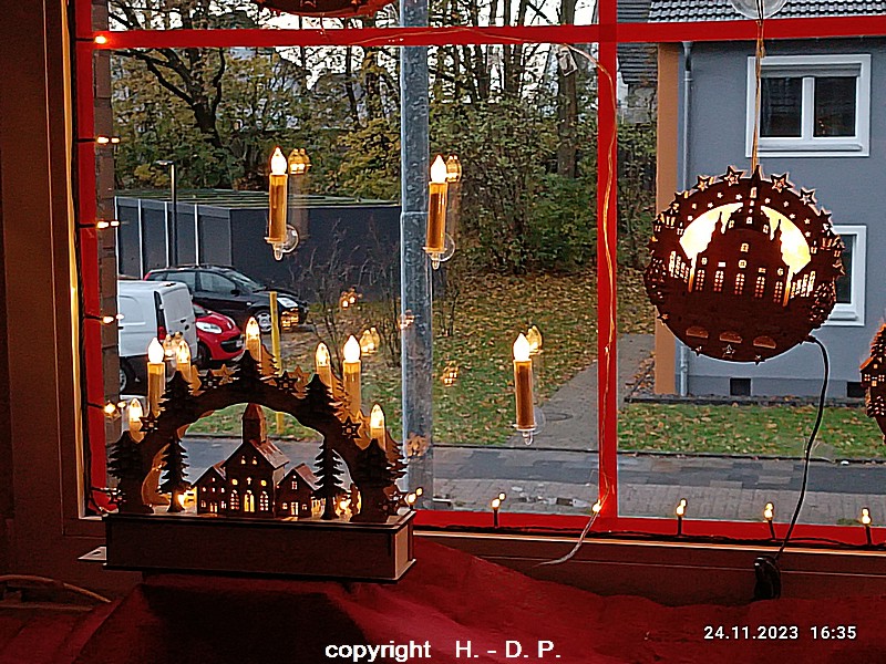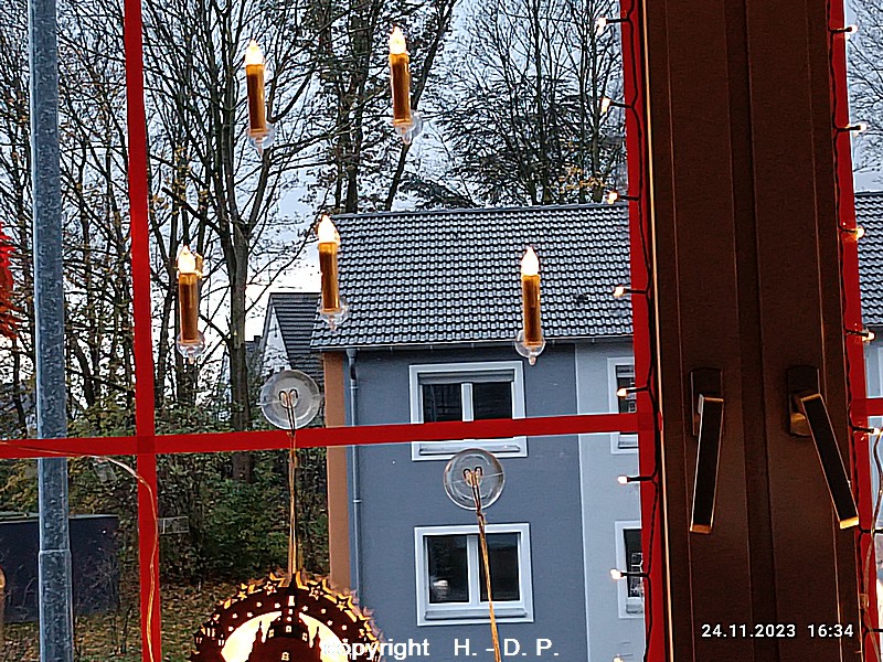 Ich habe ja auch an allen Fenstern zusammen insgesamt 50 Kabellose Christbaumkerzen angebracht und da die mit Batterie betrieben werden lasse ich die täglich von 17 - 24 Uhr brennen, denn Batterien habe ich mir im Laufe des Jahres ca. 300 Stück angeschafft und das sollte für die Weihnachtszeit ausreichend sein, denn ich habe ja auch noch ein Batterie Aufladegerät mit dem ich die Batterien noch 2 x wieder aufladen kann.