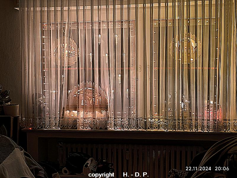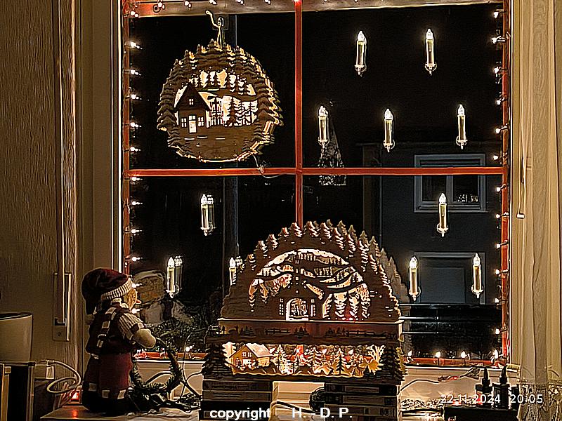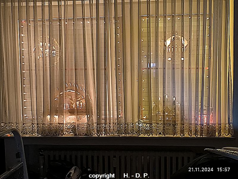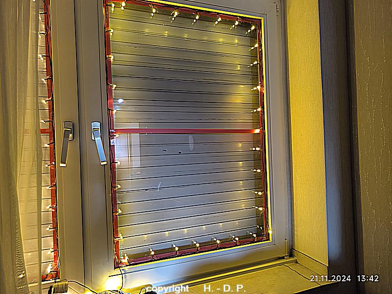 Am Mittwoch den 20.11.2024 ging es mit dem Fenster des ehemaligen Kinderzimmer weiter. Zuerst kam das Fensterputzen, dann die Scheiben abkleben und dann ging es mit Lichterketten und den Holzfensterbildern weiter. Auch ein größerer Schwibbogen fand noch seinen Platz auf der Fensterbank und auch noch ein kleiner Lichterbogen. Auch eine kleine beleuchtete Keramik Kirche fand noch ihren Platz.
