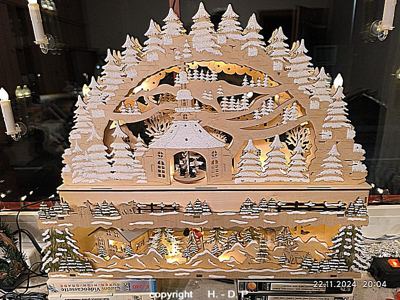 Die Holzfensterbilder, der Schwibbogen und der Lichterbogen können mit Batterien oder mit einem Adapter auch über das Stromnetz beleuchtet werden und habe mich für den Adapter entschieden, denn dann geht alles gemeinsam um 17:00 Uhr an und um 23:00 Uhr wieder aus und gesteuert wird das über eine Schaltzeituhr.