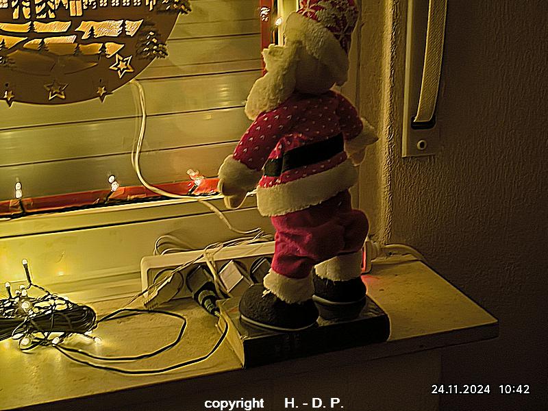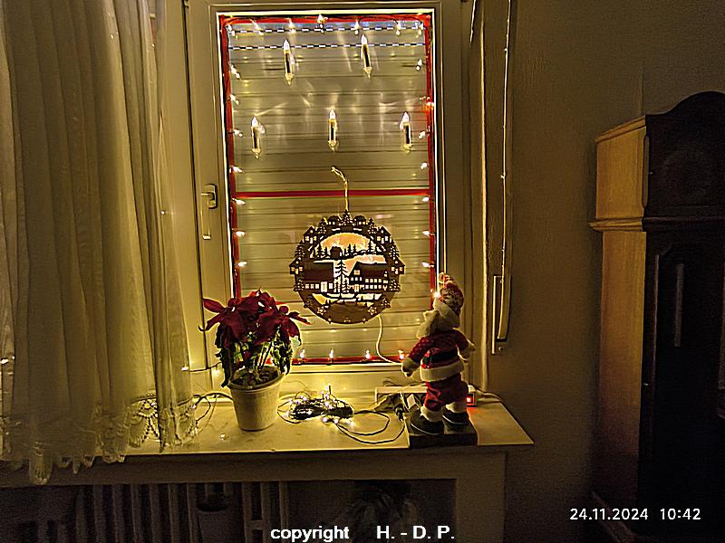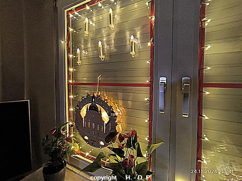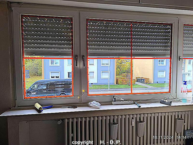 Eine Woche nach meinem Spielzimmer habe ich am Montag den 18.11.2024 mein Wohnzimmerfenster geschmückt. Natürlich fing alles wieder mit dem Fensterputzen an. Dann wurden die Scheiben wieder mit rotem Klebeband abgeklebt und die beiden 80er LED Ketten am Fenster befestigt. Das ganze hat natürlich mit Pausen, denn man wird ja auch nicht jünger, fast den ganzen Vormittag gedauert.