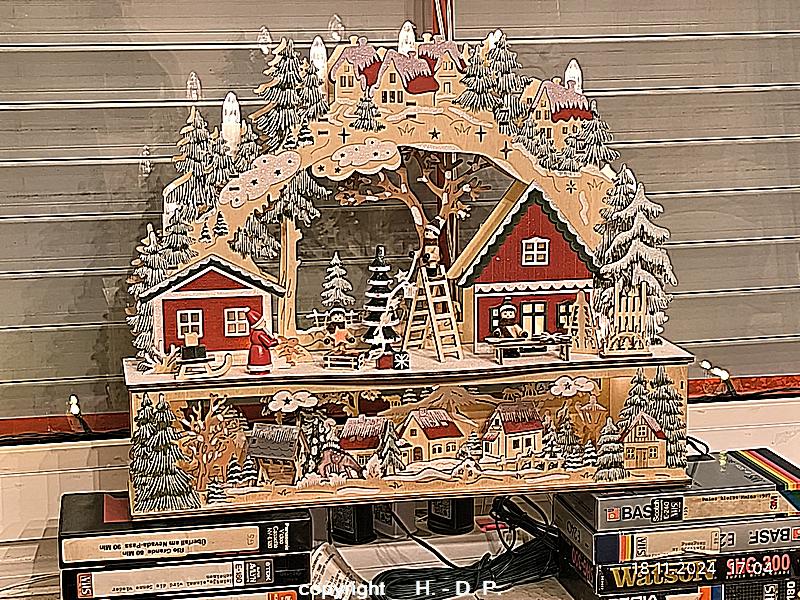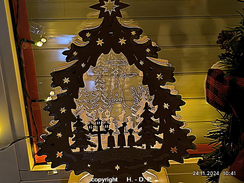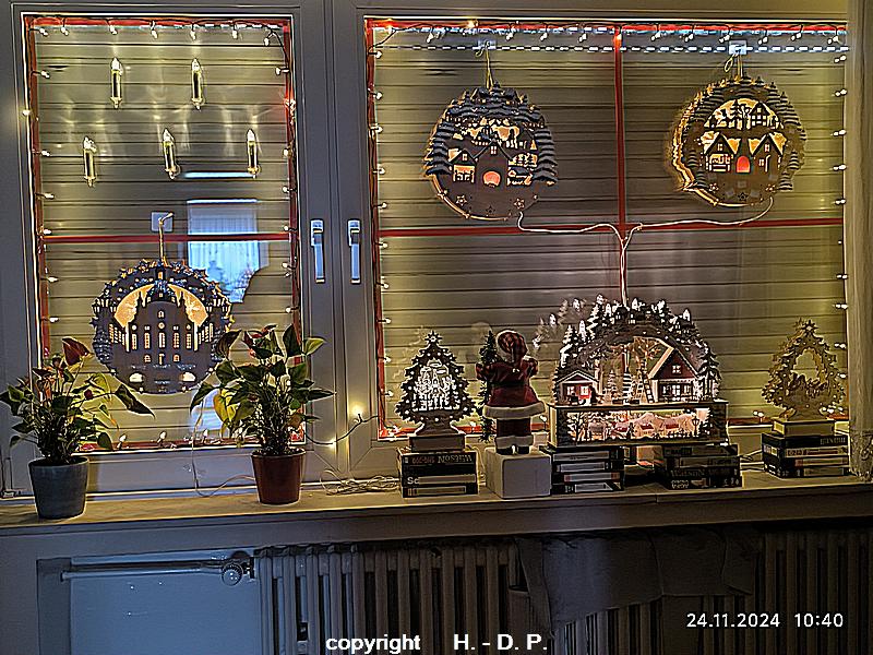 Nachdem die Lichterketten an den Scheiben waren wurden die Holz Fensterbilder mit den so genannten Magischen Haken an der Scheibe befestigt. Dann folgten noch einige kabellose Christbaum Kerzen die mit Haltern an den Scheiben befestigt wurden. Da meine Frau noch einige Christsterne hat, konnte ich die Fensterbank nicht so voll machen wie sonst in den Jahren und so stehen auf der Fensterbank in diesem Jahr nur ein größerer Schwibbogen und 2 beleuchtete Holztannen.