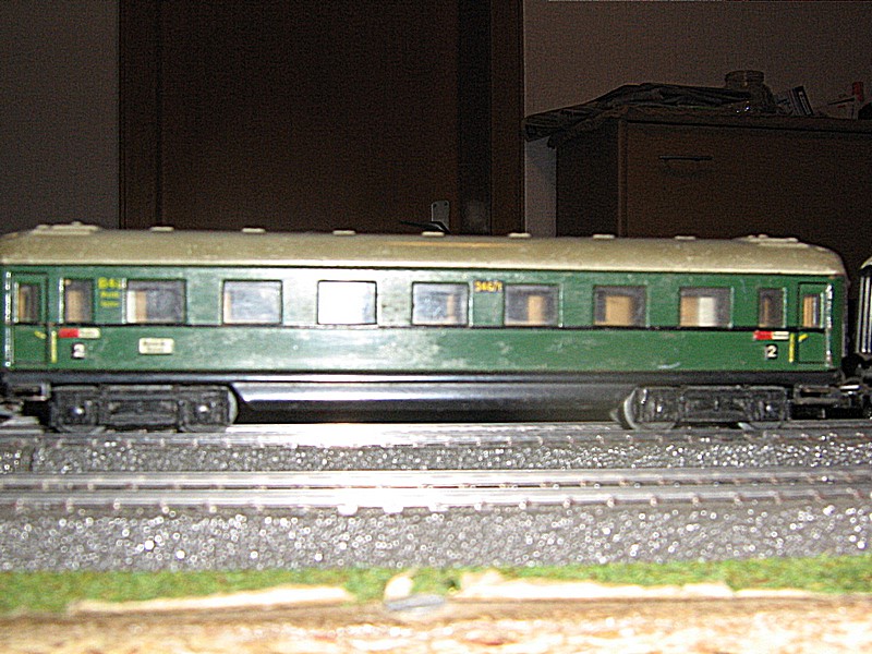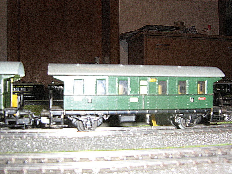 Der zweite Zug war ein Schnellzug aus dem Jahre 1954, Leider nicht mit der Original Lok sondern mit der E 44 Nr. 3011 Bj. 1966 - 1967. Als Wagen kamen zum Einsatz die alten Schürzenwagen der Serie 346 und zwar 1 x 346/1, 1 x 346/3, 1 x 346/3J, 1 x 346/5 und 1 x 346/1. Alle Wagen stammen aus den Jahren 1951 - 1952. Was mich persönlich gewundert und gleichzeitig sehr gefreut hat, ist das der Wagen mit dem Schlußlicht auch nach 54 Jahren immer noch brennt. Auch bei diesem Zug kam wieder das "selige Modellbahnlächeln "auf mein Gesicht. Nach einigen Runden ging zu meiner großen Überraschung noch das Licht in dem Postwagen an.