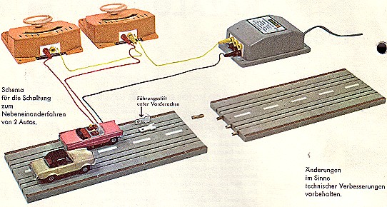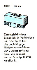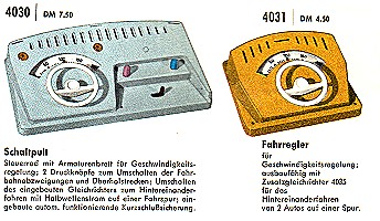 Nach den recht stürmischen Anfangsjahren, gab es im Katalog 1965 / 1966 nicht viel neues. Neu war nur ein Gleichrichter, der es ermöglichte 2 Autos unabhängig von einander fahren zu lassen. Es wurde auch Zeit das so etwas möglich wurde, denn der Gleichrichter der in dem Fahrpult 4030 eingebaut war funktionierte wenigstens bei meinem Gerät nie.