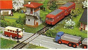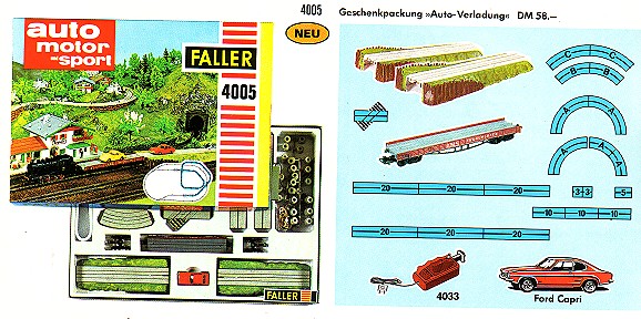 Die Firma Faller, immer für eine Überraschung gut, brachte im Modelljahr 1970 etwas was sich viele Modellbahner schon lange gewünscht hatten, nämlich die Verbindung Schiene Straße. So erschien im Katalog 1970 erstmals eine Autoverladung. Nun konnte man über eine einspurige Straße mit einem Auto, PKW oder auch LKW auf einen Niederbordwagen fahren. Ein einfaches aber geniales System, das schnell sehr viele Freunde fand.