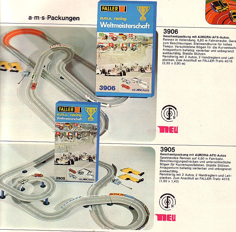 Mit der Einführung der AURORA Fahrzeuge in das Faller Programm begann eine neue Ära bei den Rennspielen und setzte gleichzeitig das eigentliche und ursprüngliche Faller Verkehrsspiel fast schachmatt. Die ersten neuen Rennpackungen im neuen Look.
