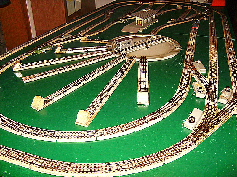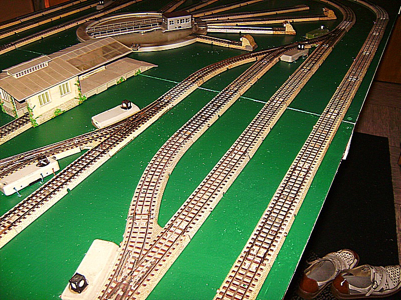 So jetzt ist ein großer Teil geschafft, Die Schienen der beiden Kreise sind verschraubt, ebenfalls die Drehscheibe und die dazugehörigen Gleise. Noch nicht verschraubt sind die Gleise der Abstellgruppe, weil da noch an einigen Schienen ein Kabel angelötet werden muß und Kabel muß ich auch noch besorgen. Wenn das geschehen ist, werden die Platten geteilt und die Mittelleiter Verbindungen an den Schienen der Plattenkante werden entfernt. Auch muß noch alles verkabelt werden, was noch einige Tage dauern wird.