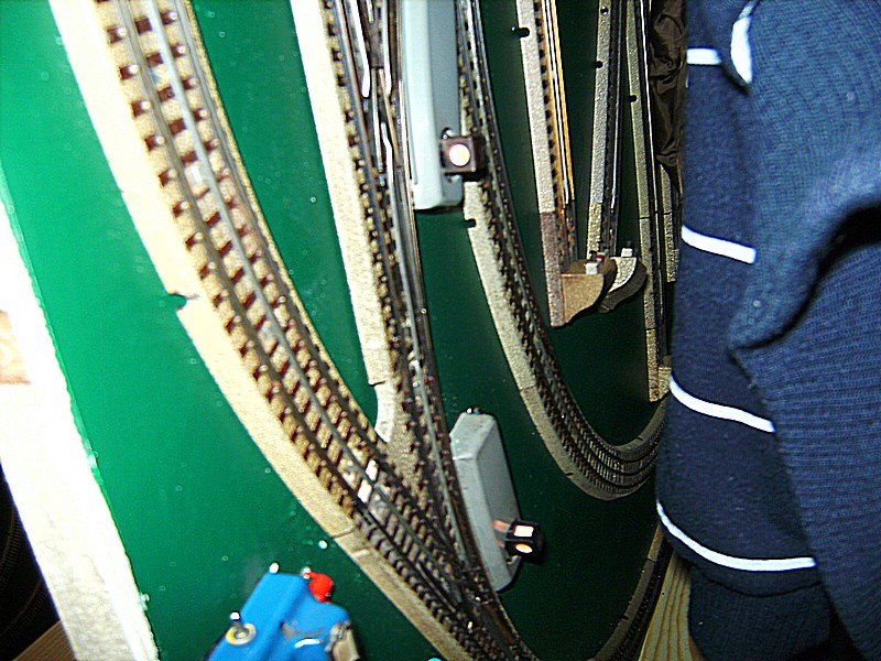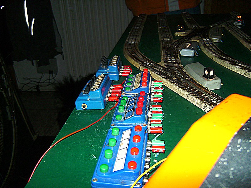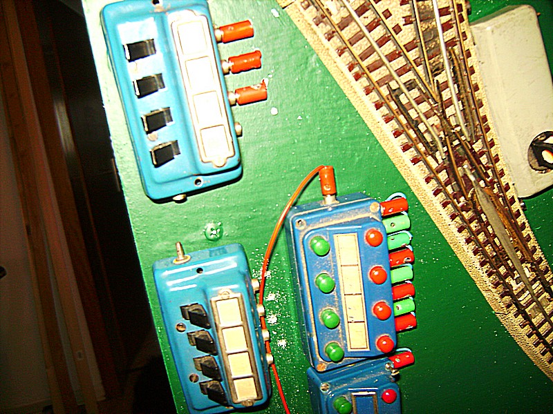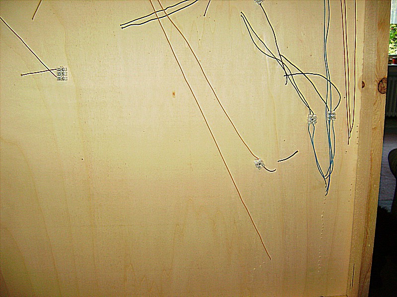 Heute habe ich 6 Weichen und 2 DKW?s angeschlossen. Damit ich besser arbeiten konnte, habe ich in meiner Diele vor der Garderobe 2 Böcke aufgestellt und darauf eine ca. 1,20 x 0,65 m große Spanplatte gelegt. Der rechte Teil der Anlage wurde dann hochkant mit der Unterseite nach vorne, gegen die Garderobe gelehnt. Die Stellpulte wurden nur provisorisch mit dem Trafo verbunden, damit ich sofort probieren konnte ob die Weichen auch gingen.