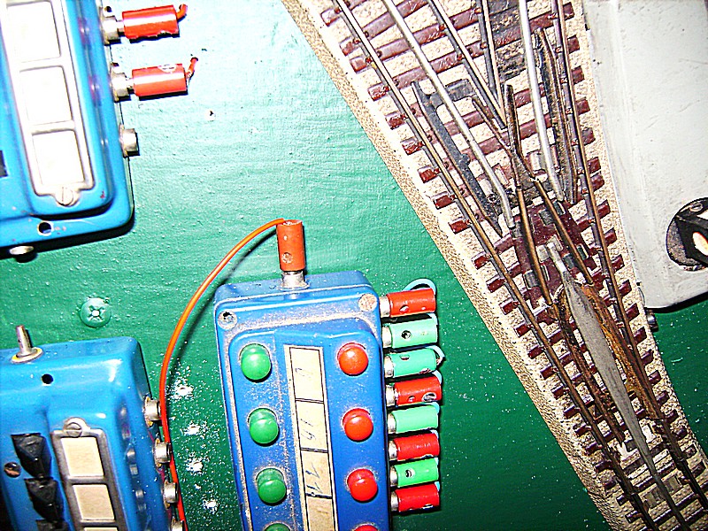 Die Kabel wurden auf dem kürzesten Weg verlegt, aber doch so, das kein Kabel durchhängt. So habe ich heute mal eben 16 Kabel für die Weichen und DKW`s, ein Licht Kabel und 4 rote Strom Kabel, für die schaltbaren Anstellgleise, verlegt. Danach wurde die Platte wieder richtig rum auf die Unterlage gelegt und dabei mußte ich feststellen, das an zwei Weichen und einer DKW das Licht nicht brennt, es ist wohl eine Birne kaputt. Auch habe ich noch Schwierigkeiten mit einer Weiche, die nicht abschaltet  und bei einer DKW geht nur ein Teil das andere leider nicht. Hier muß wohl mal ein Fachmann dran um das zu reparieren. Dann habe ich noch, heute erst an einem Gleis, den Mittelleiter rausgebrochen und den Schienenverbinder entfernt.