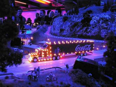 Nun kommt ein ein Fahrzeug, dass die meisten nur aus der Coca Cola Reklame zu Weihnachten kennen, nämlich der Coca Cola Weihnachtstruck. Er wurde gebaut für das Faller car system von Gerrit Braun, einem der Inhaber des Miniatur Wunderlandes in der Speicherstadt von Hamburg.