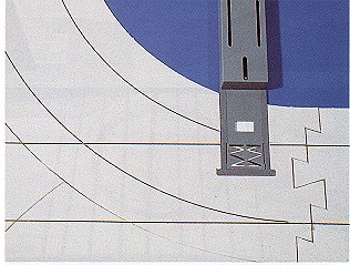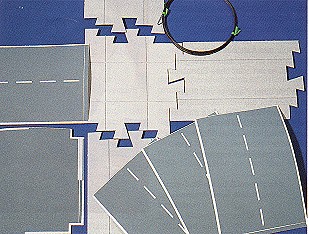 Die Straßenteile werden zusammengesteckt fast wie Eisenbahnschienen. Sie sollten aber auf der Grundplatte befestigt werden. Das kann man mit einem Tacker oder mit zweiseitigem Tesa Band machen, wobei ich letzteres vorziehen würde, Nachdem man so seine Straßen verlegt hat wird in die Einkerbung der Fahrdraht verlegt und mit Tesa  fixiert. Dann kommt als letztes die hauchdünne Straßenfolie die von der Schutzfolie befreit wird und auf die Pappstraßenteile vorsichtig und ganz genau aufgeklebt wird. Das muß sehr sorgfälltig gemacht werden um Kannte an Kannte ohne Spalt zu kleben.