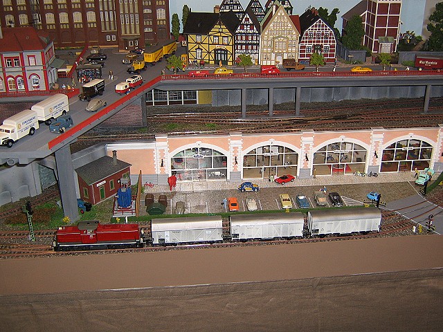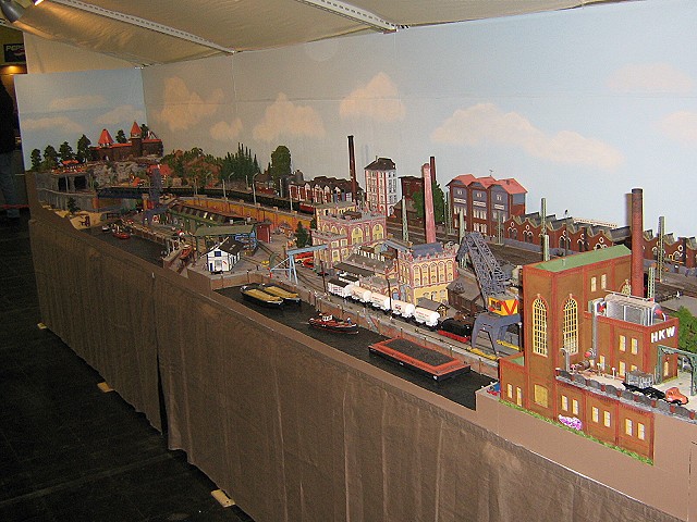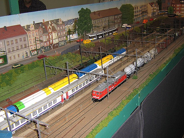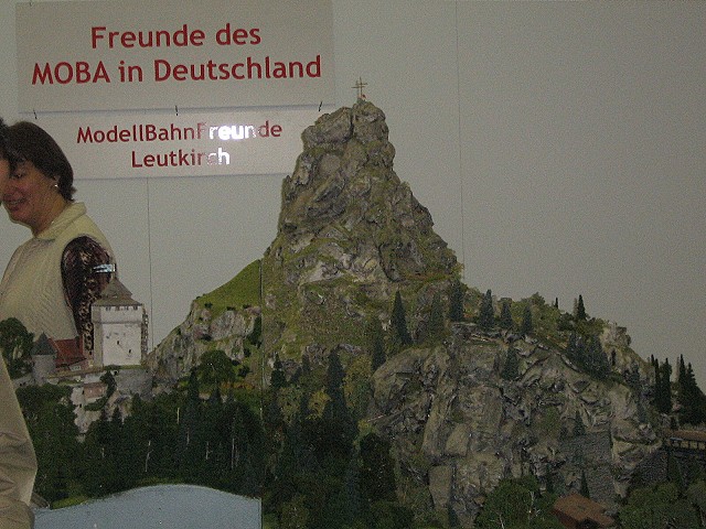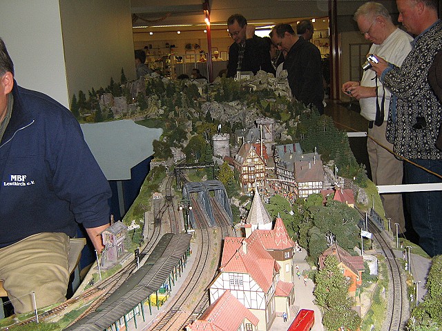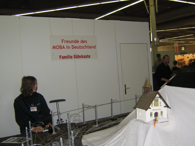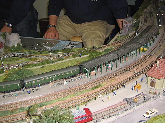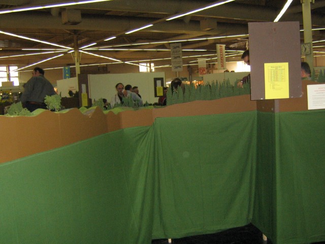 Jetzt möchte ich Euch zwei Anlagen zeigen die nach meiner Meinung, total aus dem Rahmen gefallen sind und ich meine auf solche Anlagen können wir auf Ausstellungen gut verzichten. Die erste Anlage ist eine LGB Anlage. Sie bestand aus 2 Ovalen und in der Mitte aus einem weißen Betttuch das wohl einen verschneiten Berg darstellen sollte. Die zweite Anlage, ja welche Spurweite die hatte weiß ich einfach nicht, da ich nur 1,70 m groß bin konnte ich da nichts drauf erkennen. Die Anlagenoberkante war genau so hoch wie meine Nase .- nicht das Ihr meint ich trage meine Nase sehr hoch - nein diese Anlage war unmöglich hoch, so das die Betreiber auf kleinen Leitern stehen mußten wenn sie etwas, z.B. aufgleisen wollten. Das so etwas für Kinder, die ja unsere Zukunft sind, unmöglich istm dürfte wohl jedem klar sein.